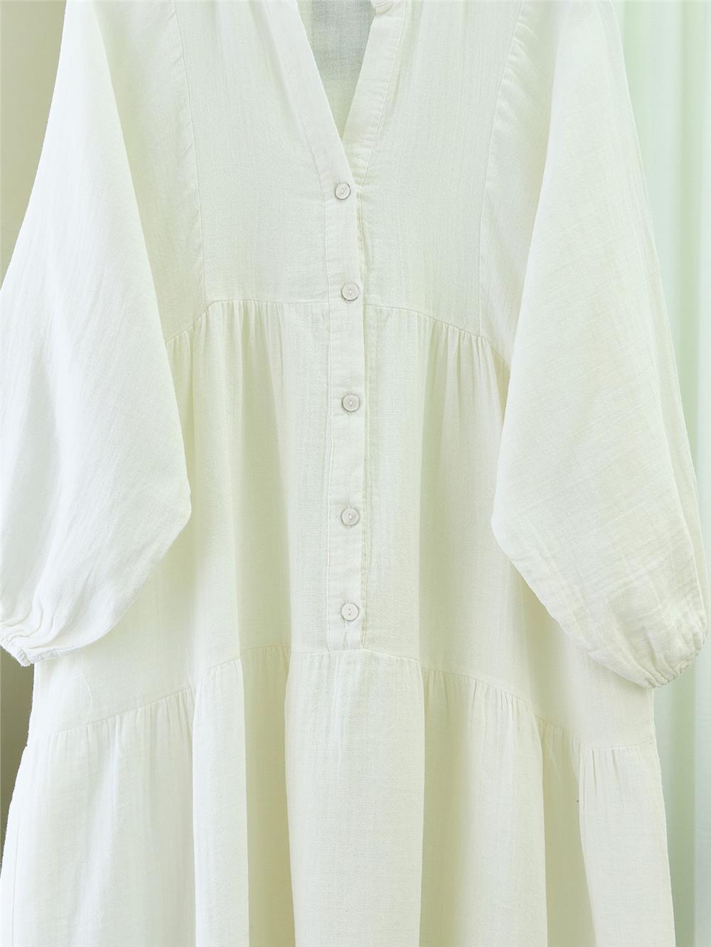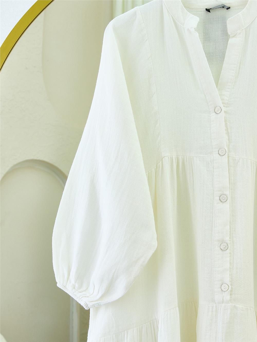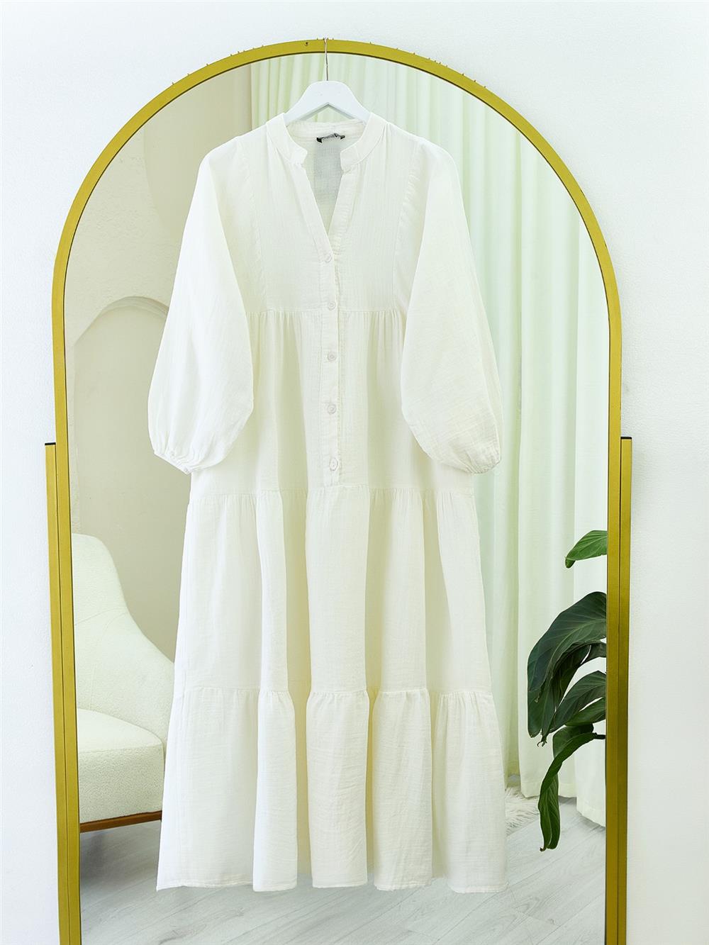 Yarım Düğmeli Parçalı Müslin Elbise -Ekru (207-2559-R07)