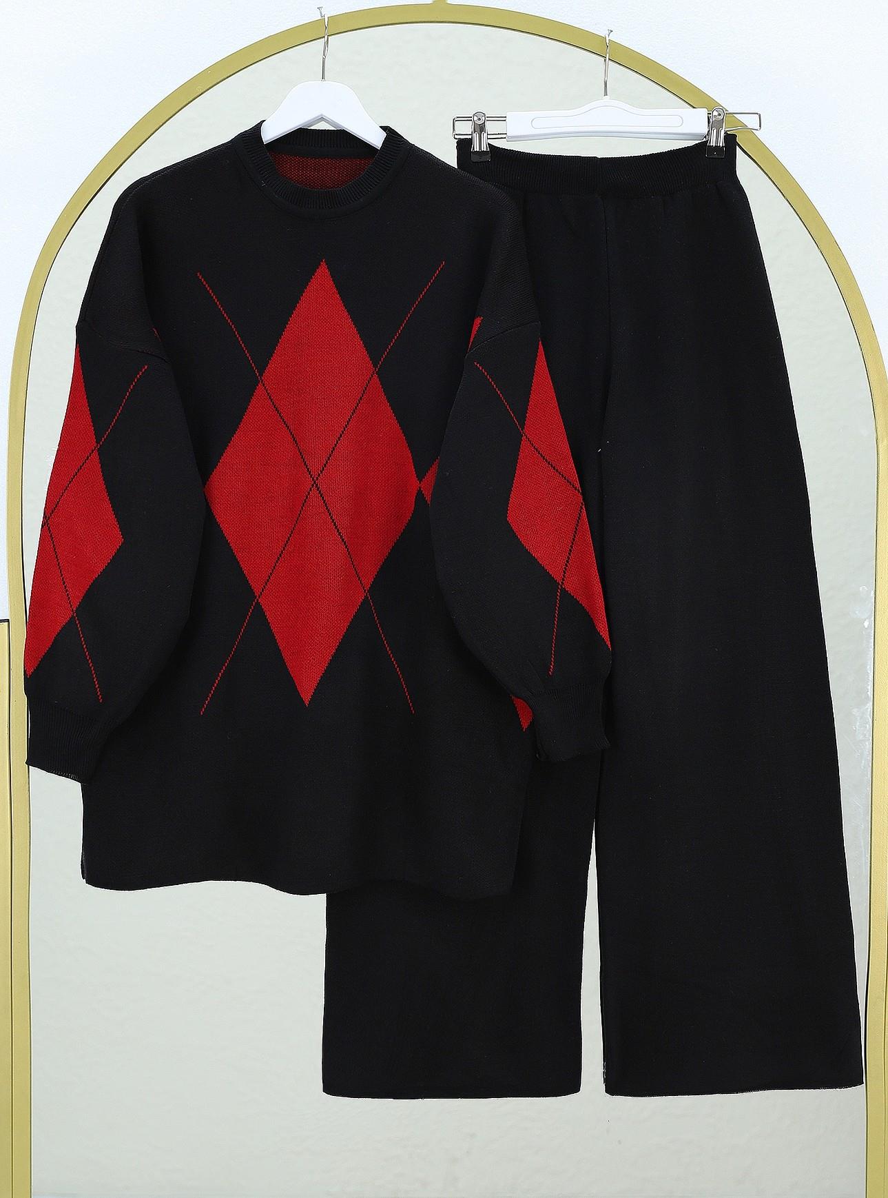 Baklava Desen Yuvarlak Yaka Triko Takım -Siyah (295-3405-R01)