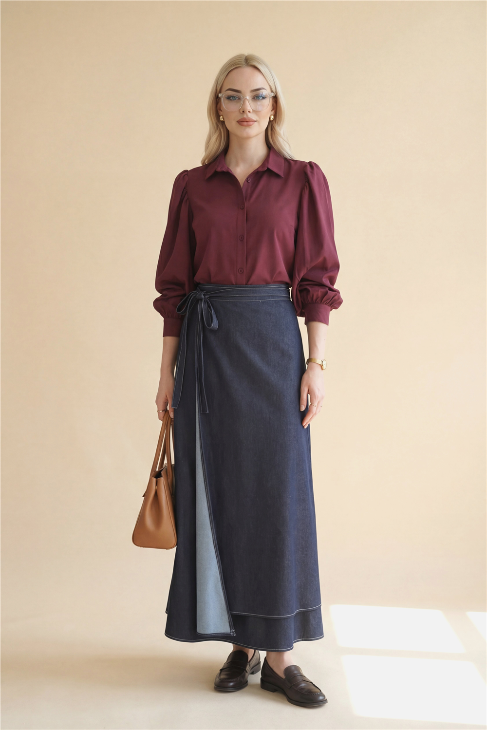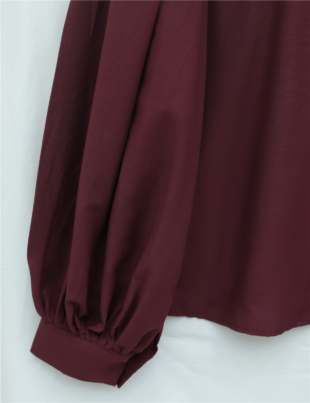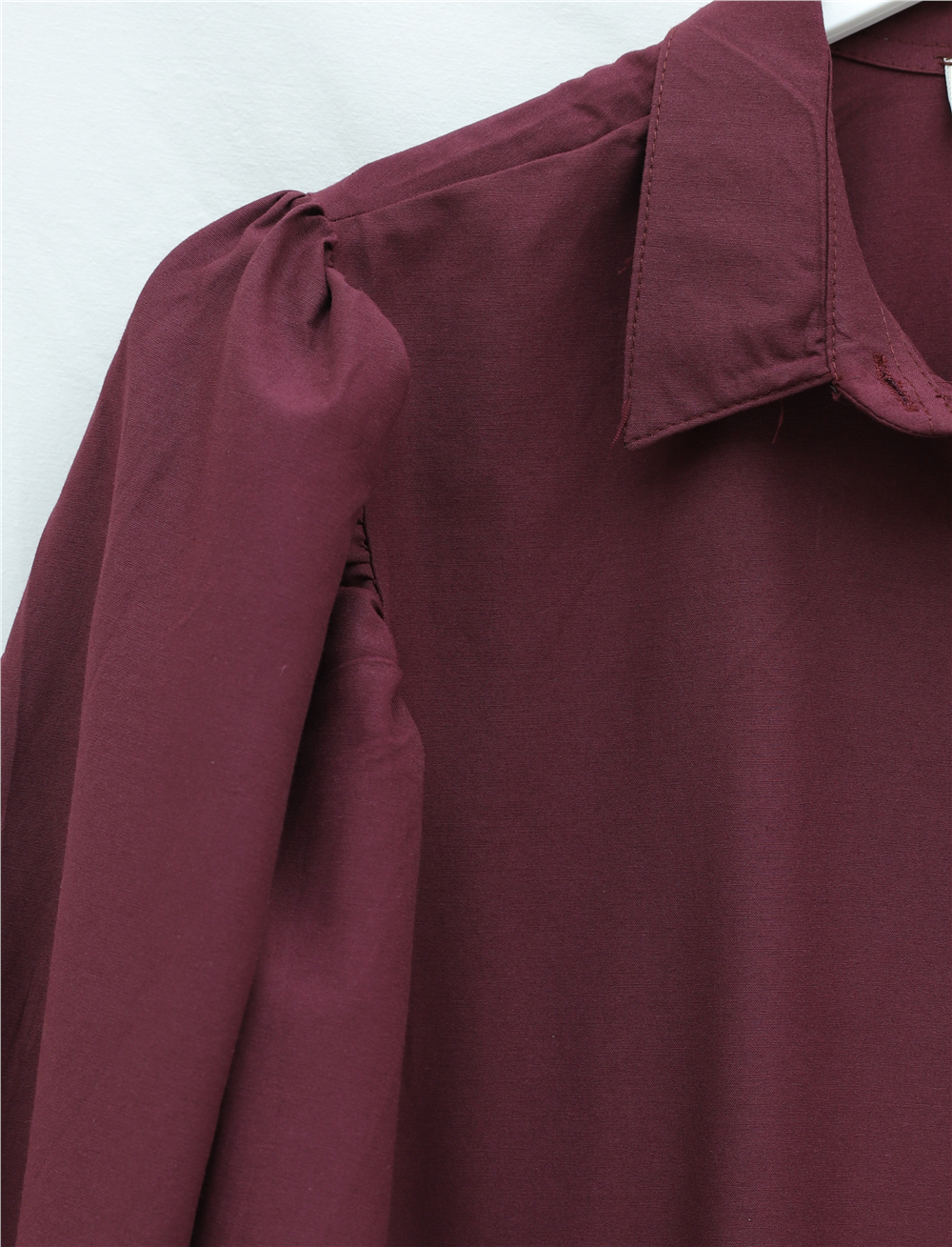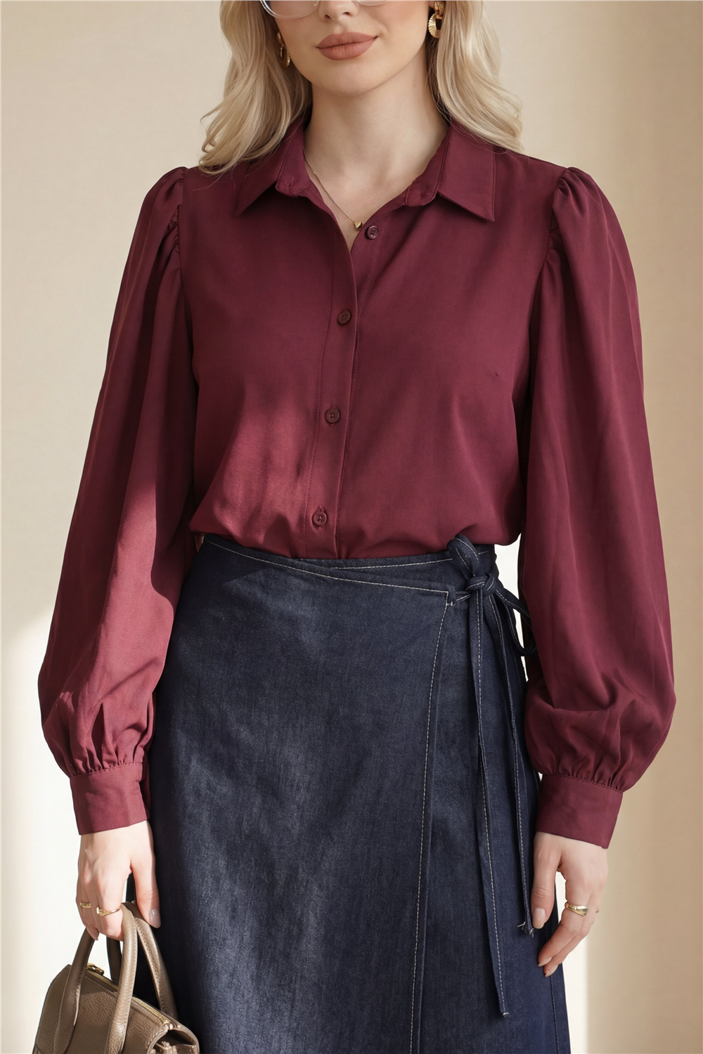Balon kol detayı gömleğe hacim ve hareket kazandırırken, düğmeli formu klasik