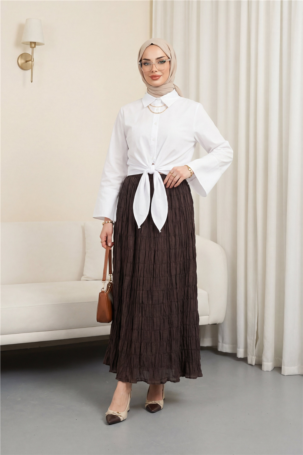 Kombindeki şal, çanta, ayakkabı ve takılar aksesuar olarak kullanılmıştır.