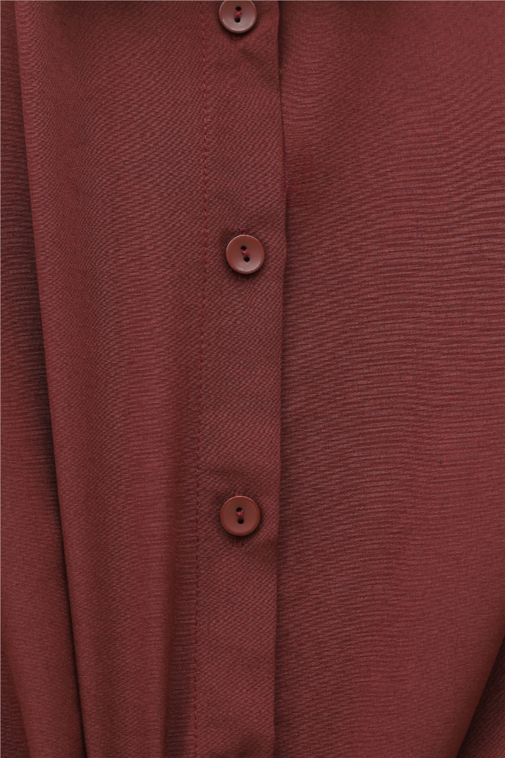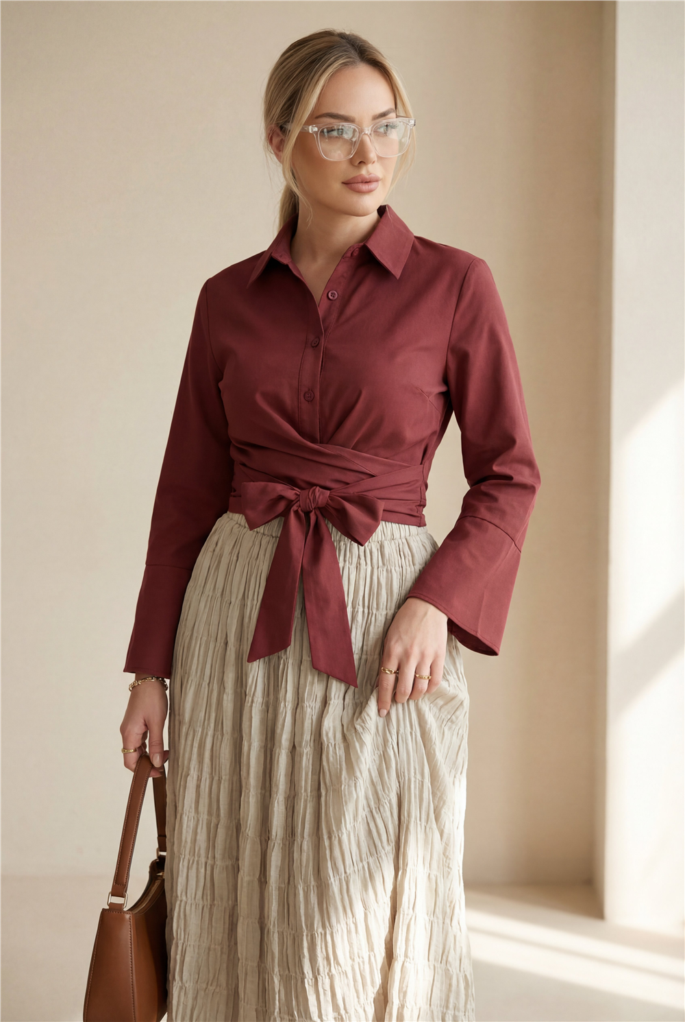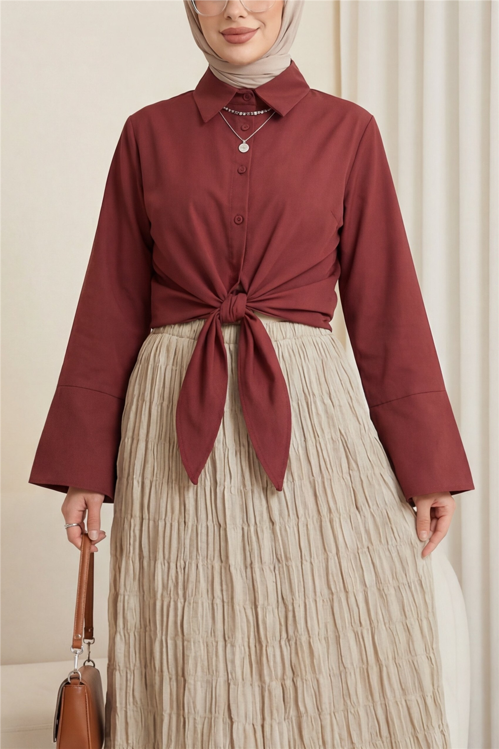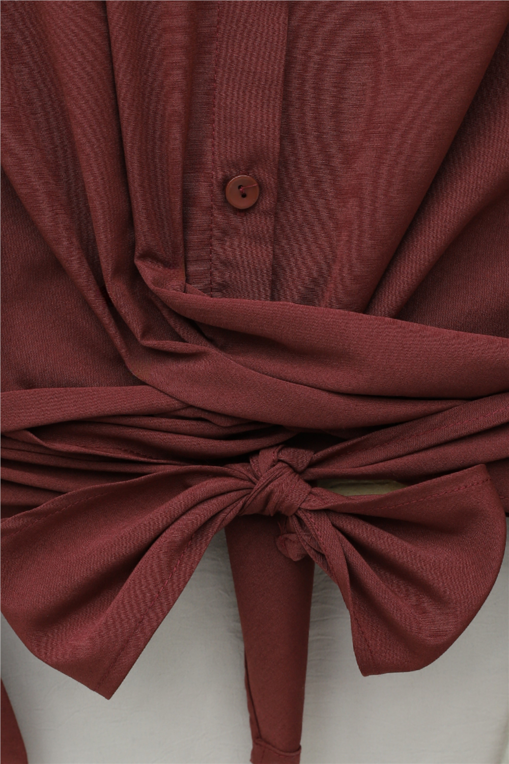 Beli Bağlamalı İspanyol Kol Poplin Gömlek Bluz -Bordo (349-7030-R04)
