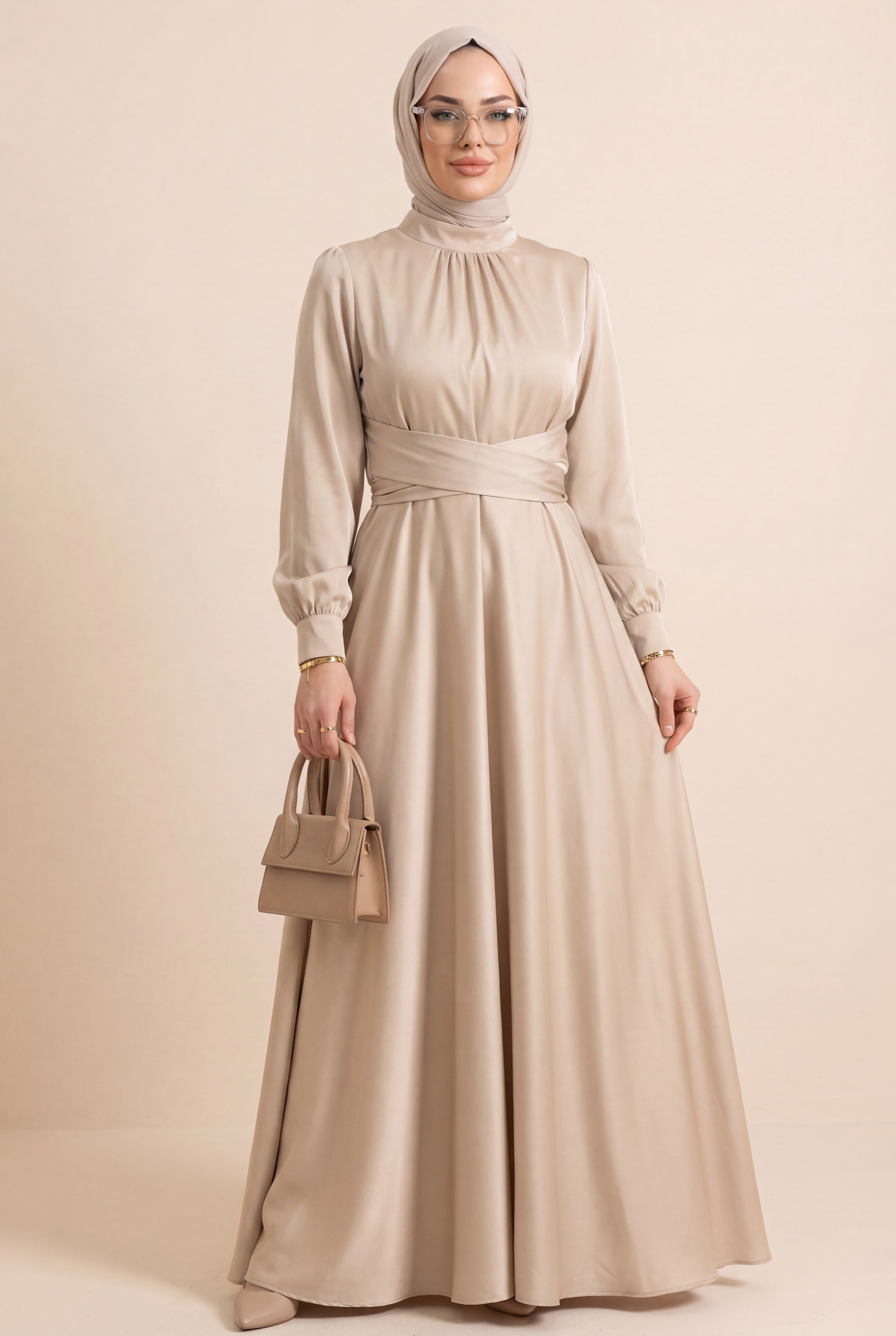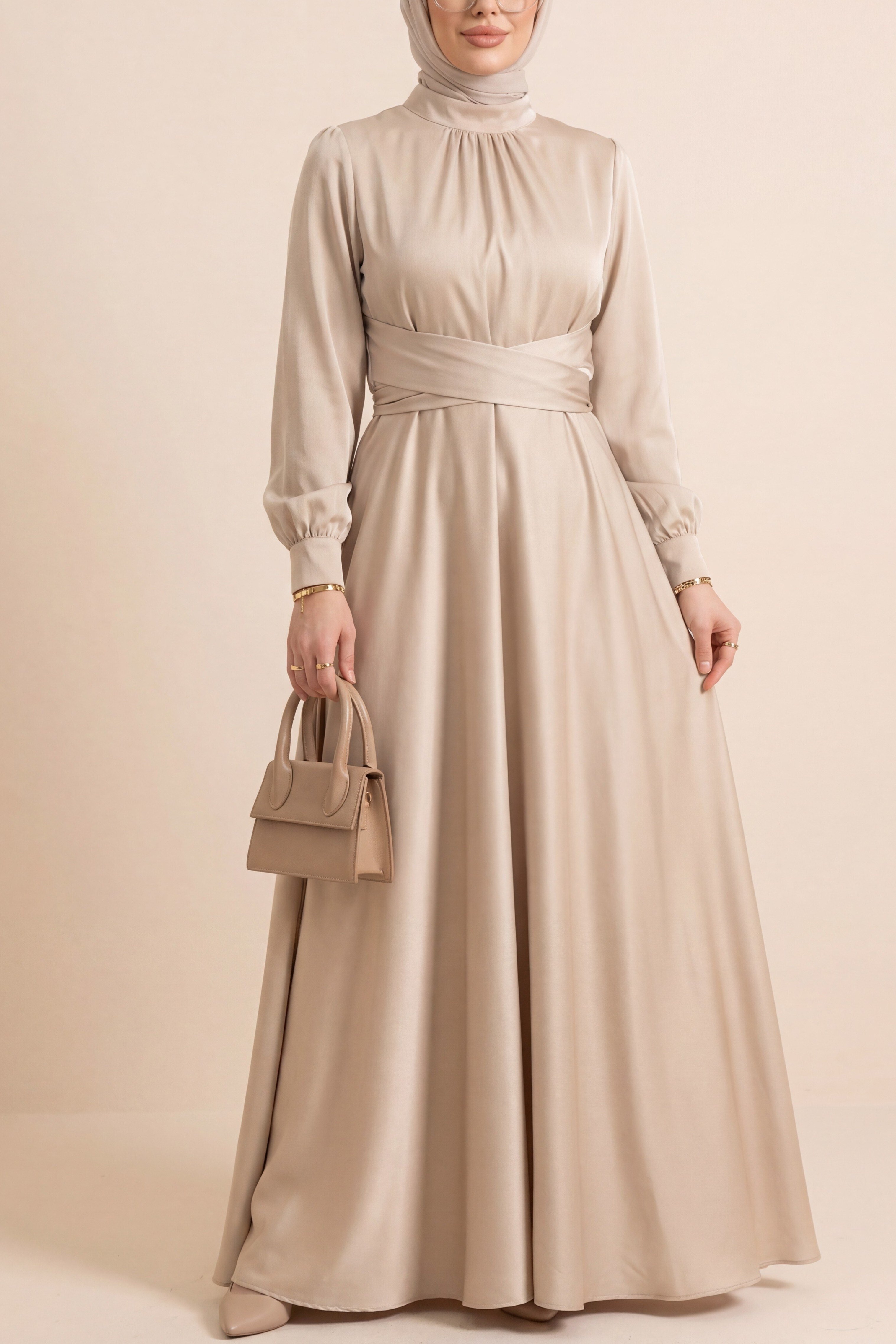 Beli Çapraz Bağlamalı Yuvarlak Yaka Saten Elbise -Bej (386-6297-R56)