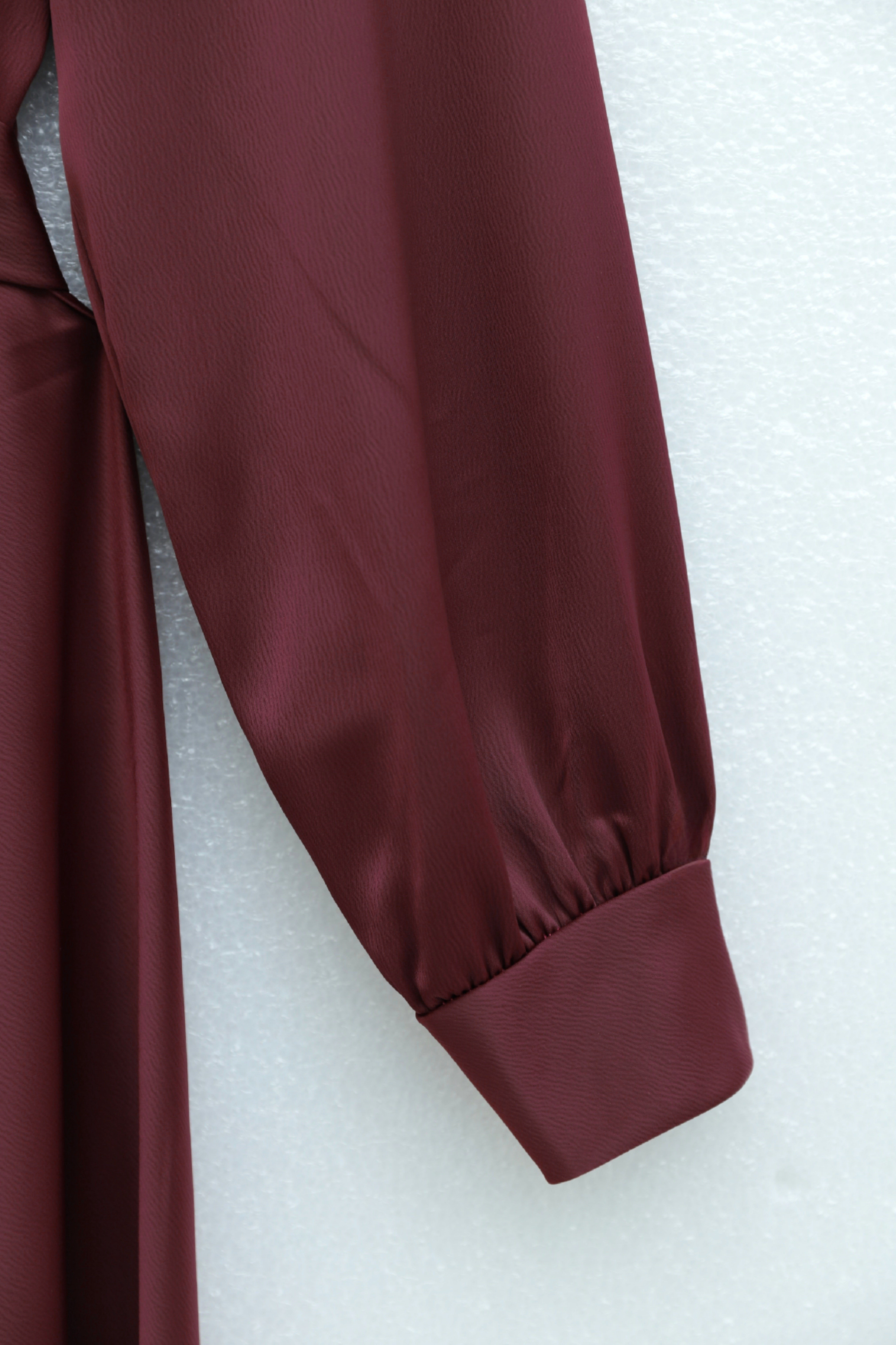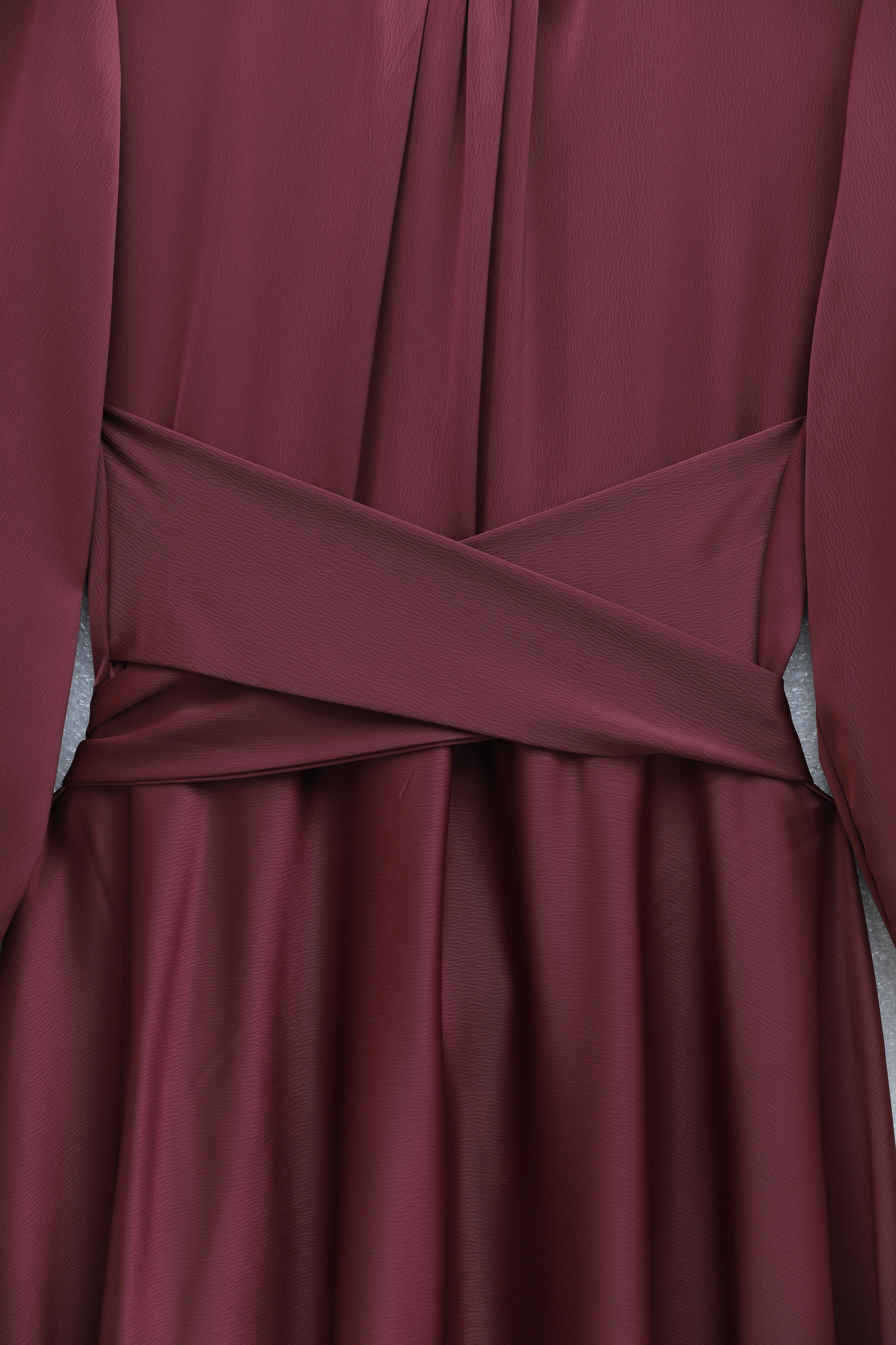 Beli Çapraz Bağlamalı Yuvarlak Yaka Saten Elbise -Bordo (386-6297-R04)