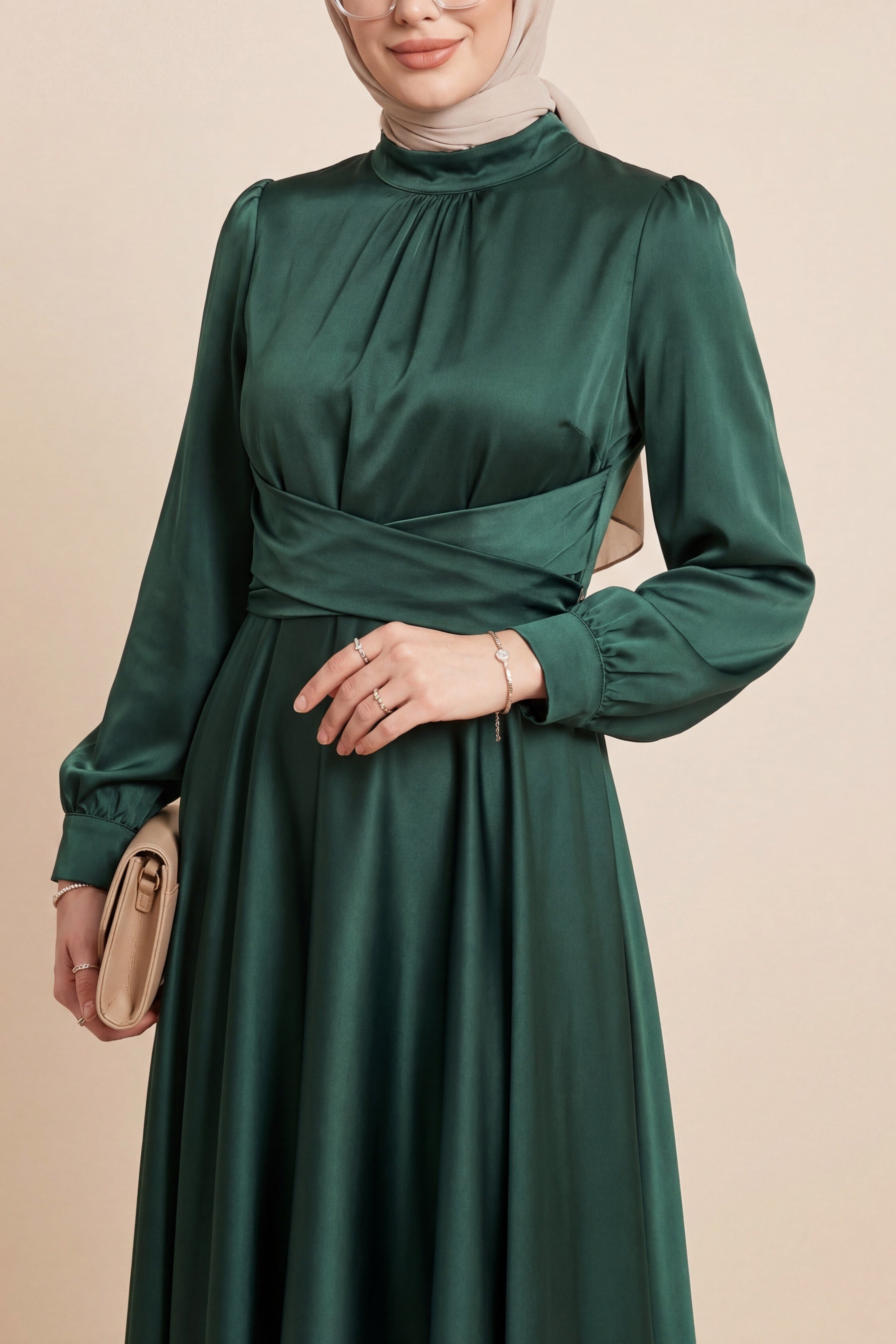 “saten kadın elbise”, “bağlamalı şık elbise”, “yuvarlak yaka elbise”, “zarif elbise modeli” gibi adlandırılabilir.