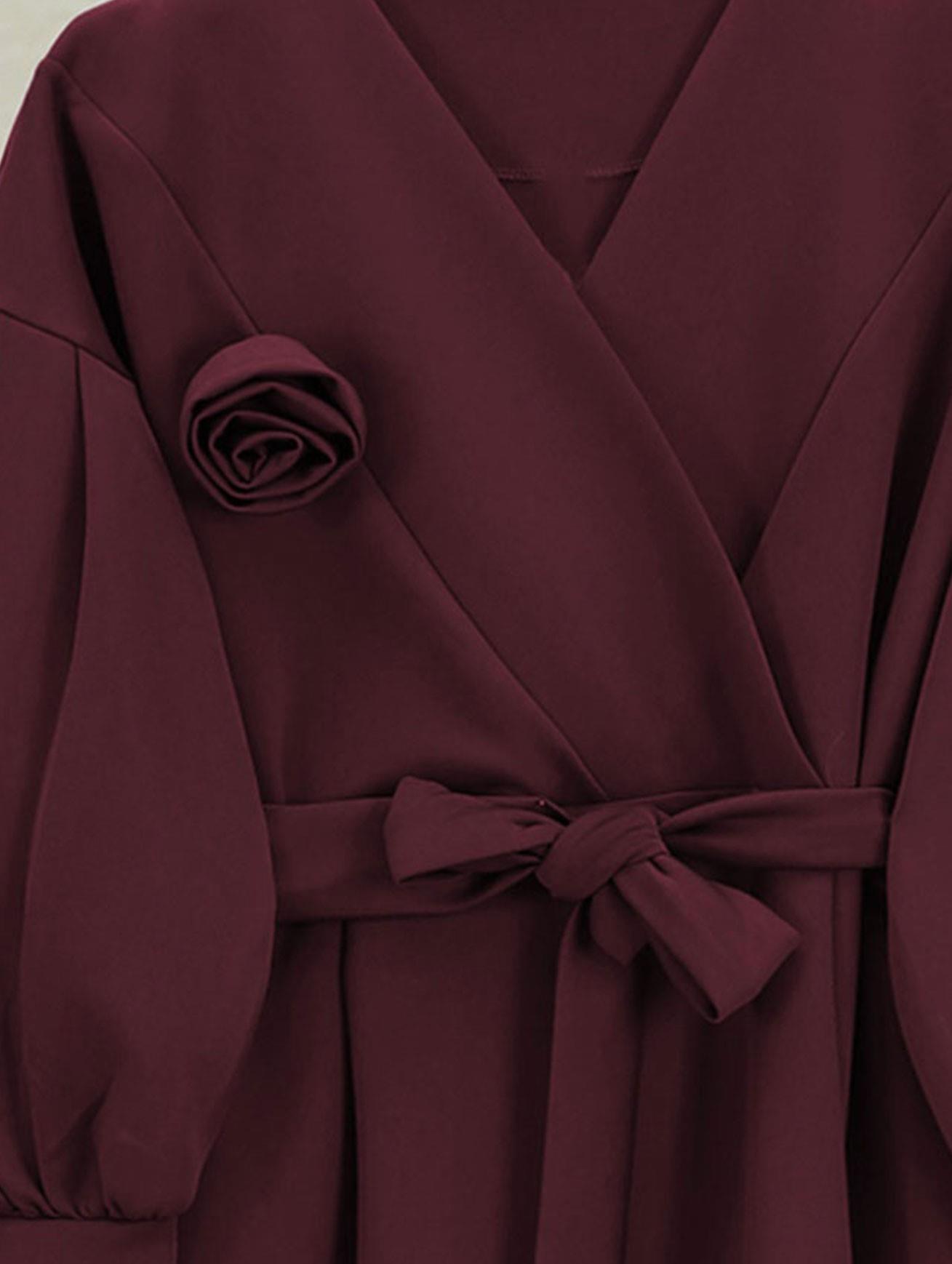 Beli Kuşaklı Çapraz Yaka Balon Kol Skuba Takım -Bordo (398-6043-R04)