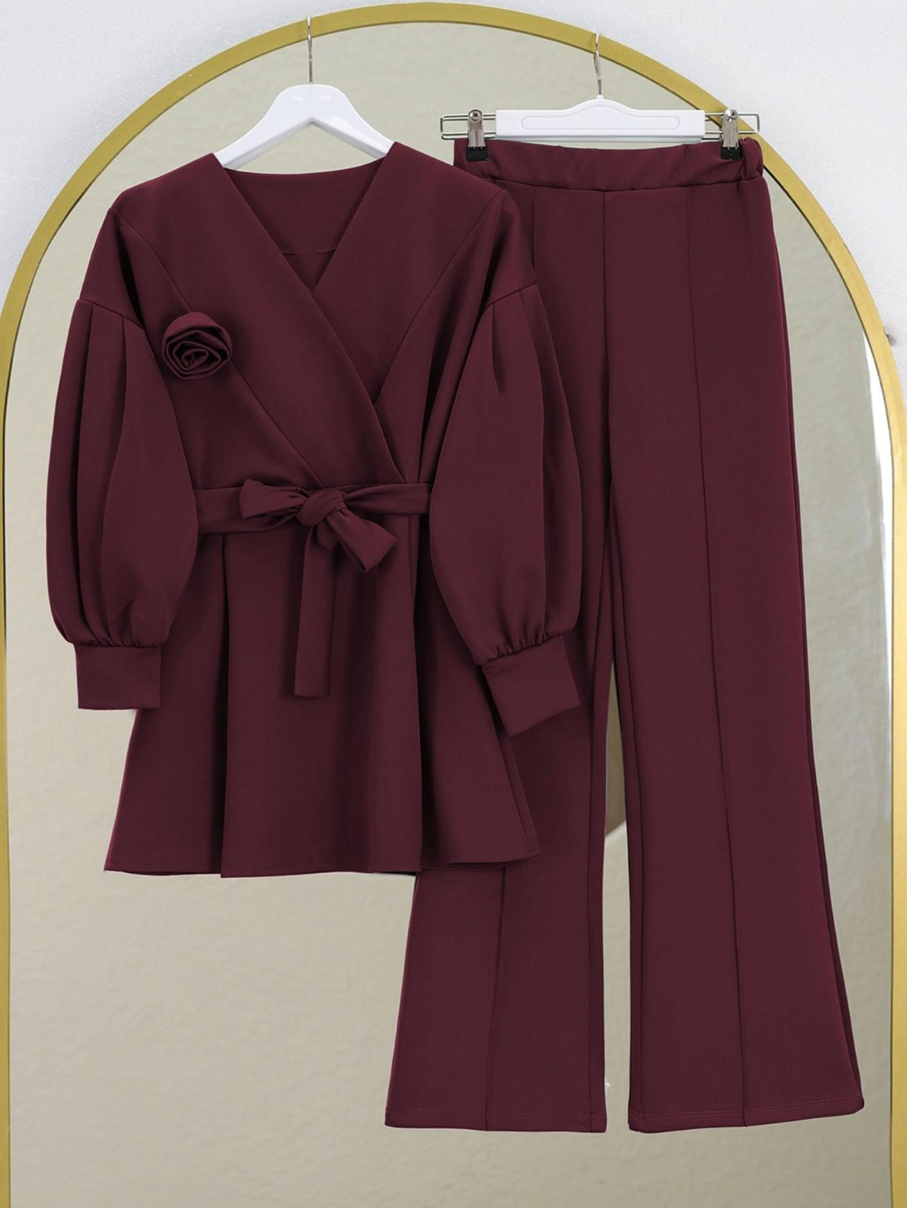 Beli Kuşaklı Çapraz Yaka Balon Kol Takım | Şıklığın ve Rahatlığın Bir Arada
