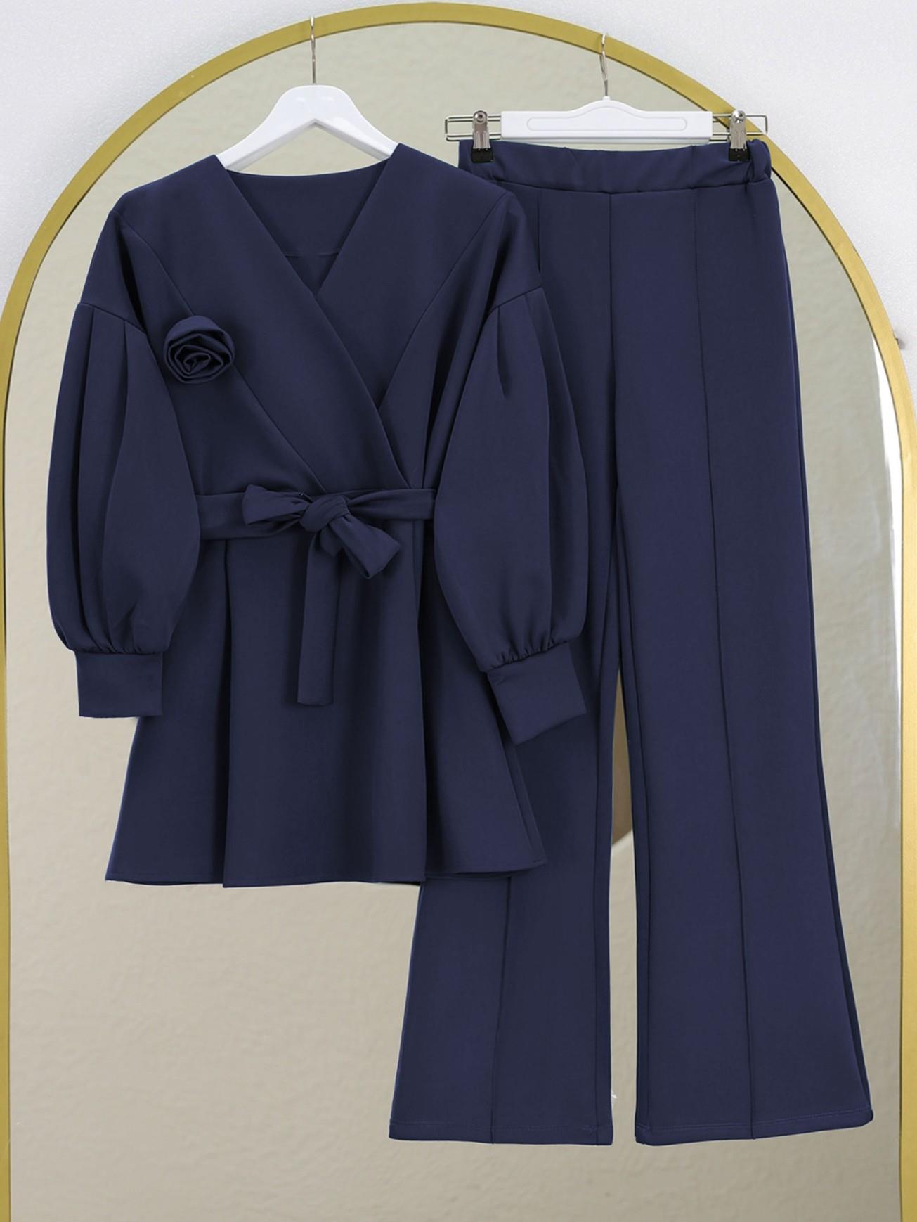Kuşaklı Bel Detayı: Takımın şıklığını tamamlayan, beli vurgulayan kuşak detayı.