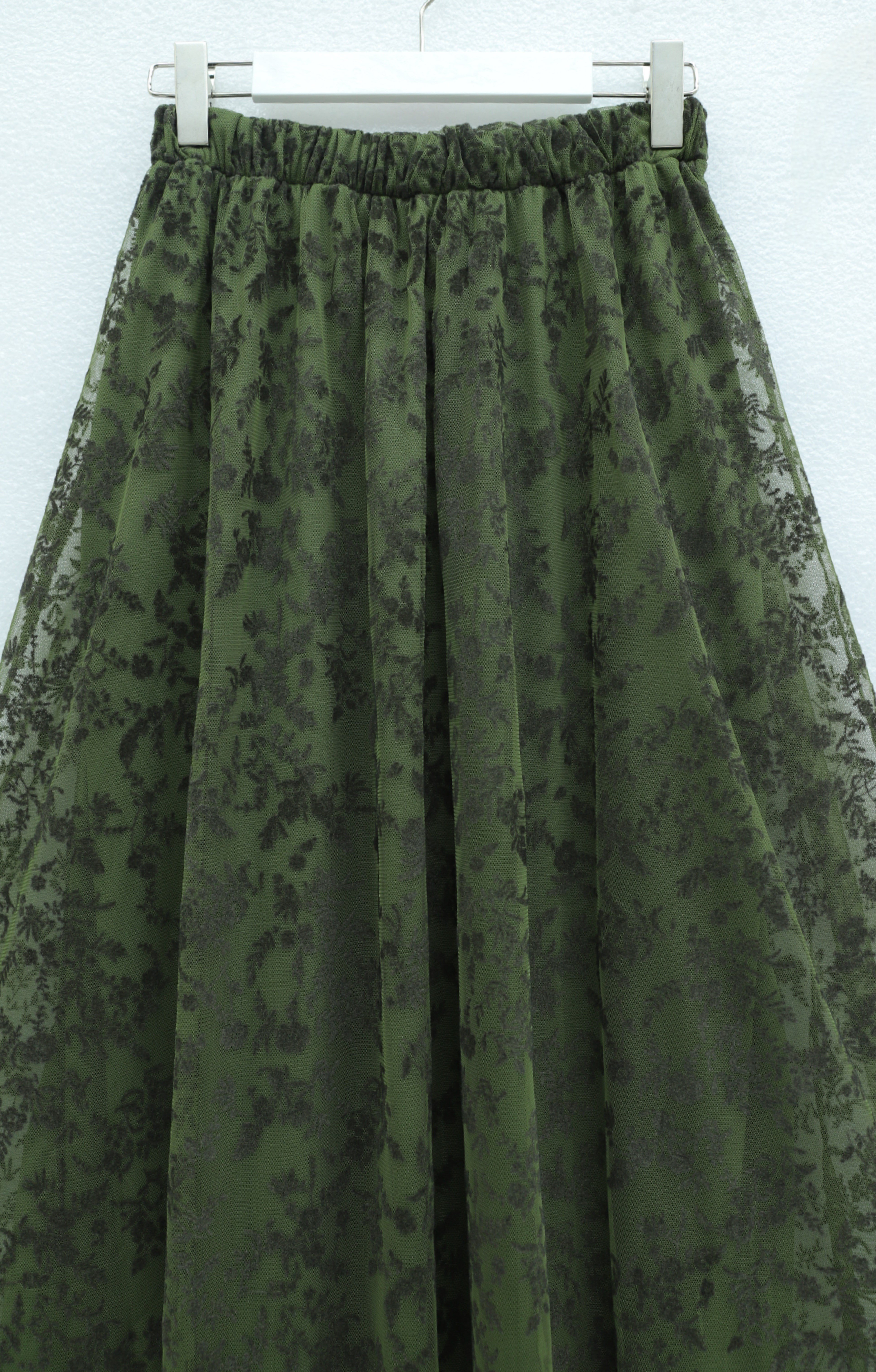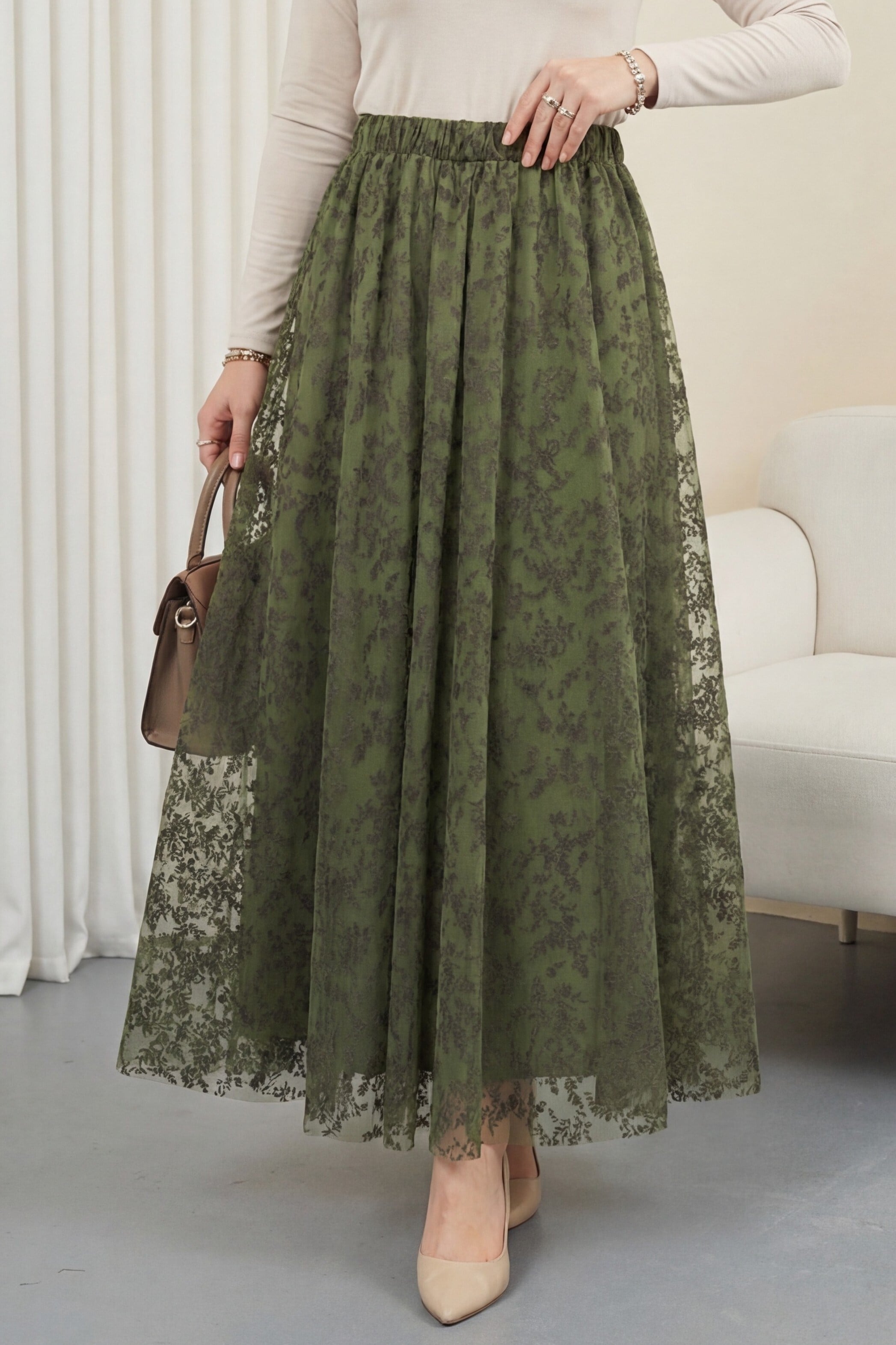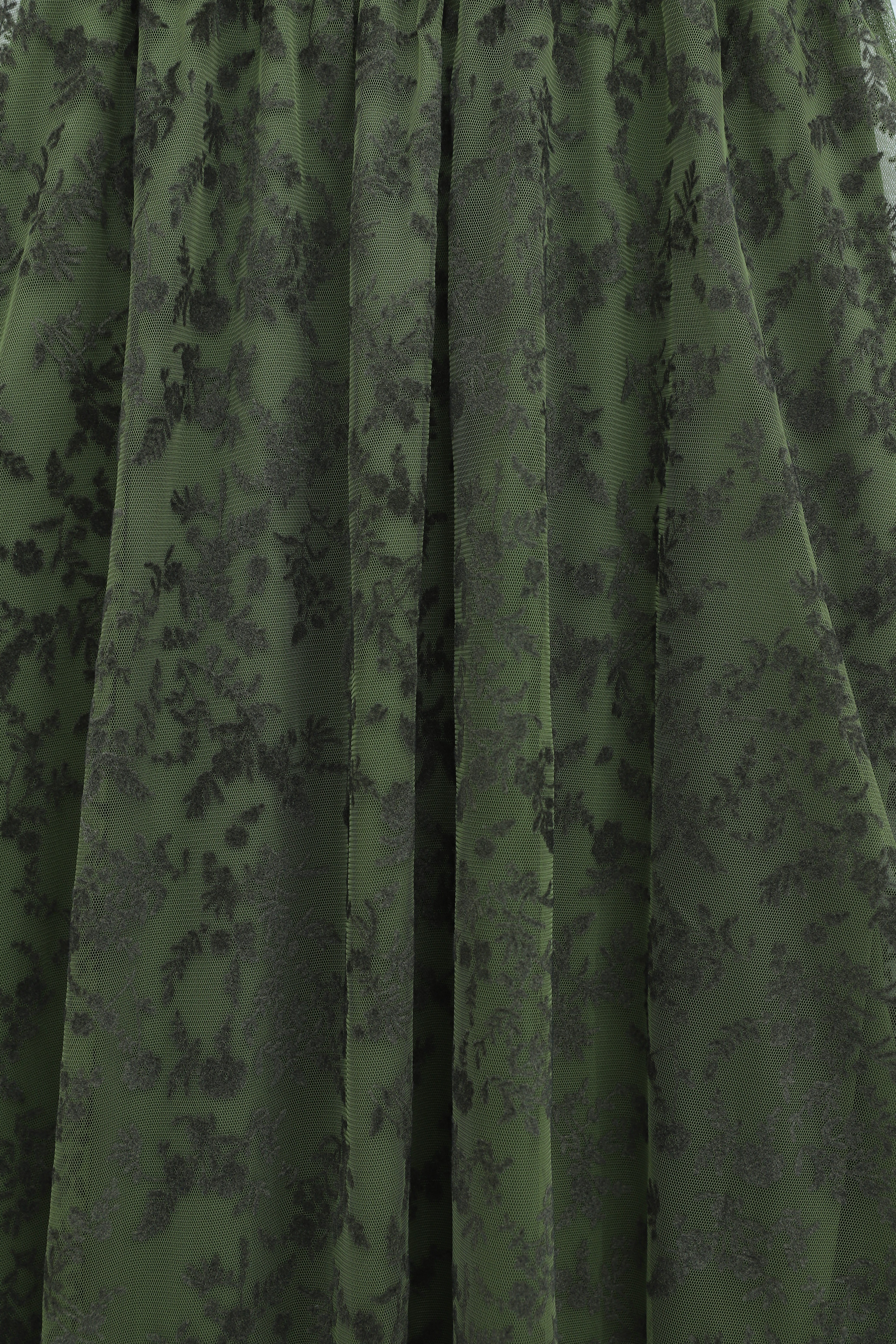 Beli Lastikli Flog Baskılı Astarlı Tül Etek -Haki (349-8064-R05)