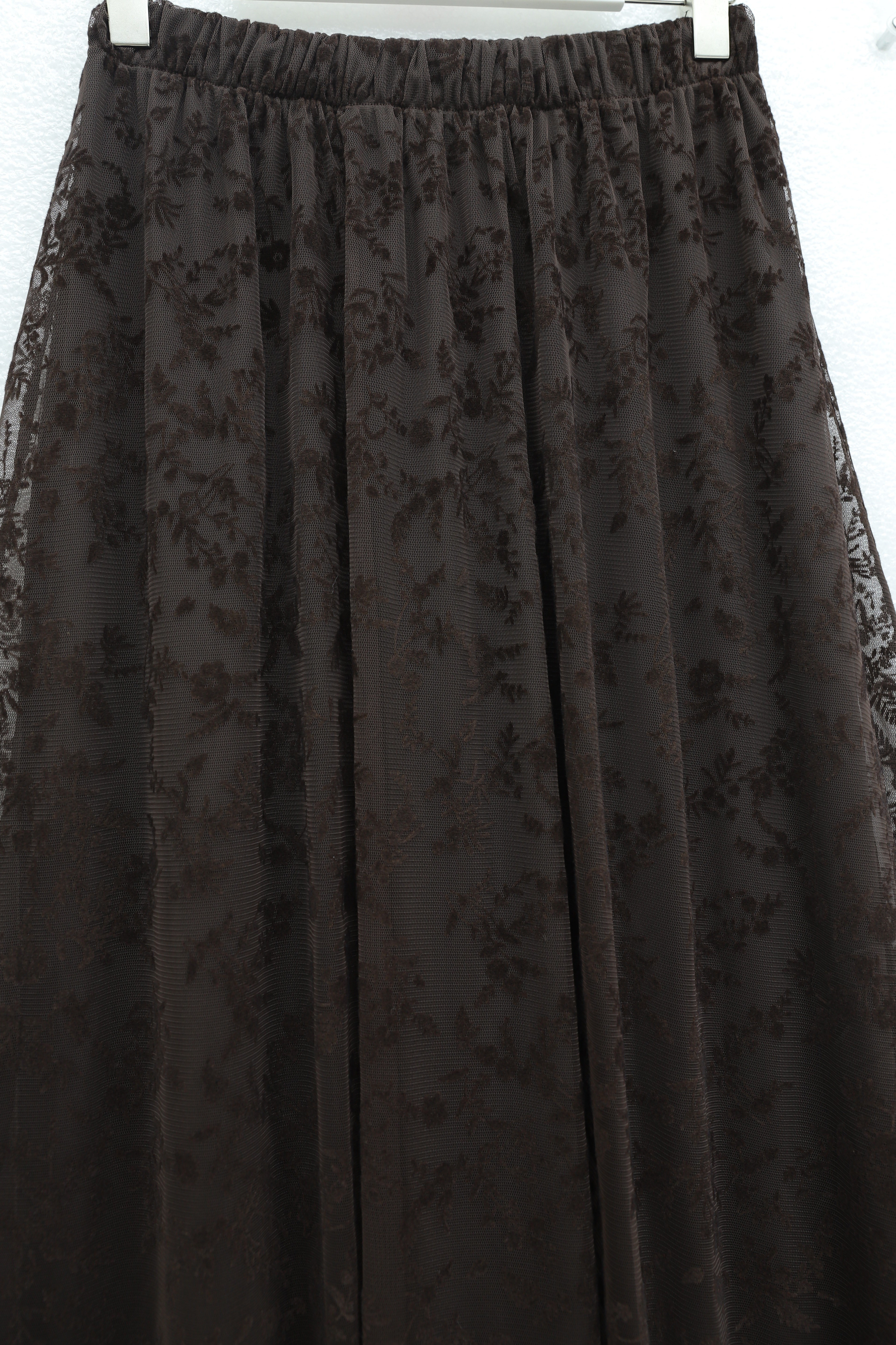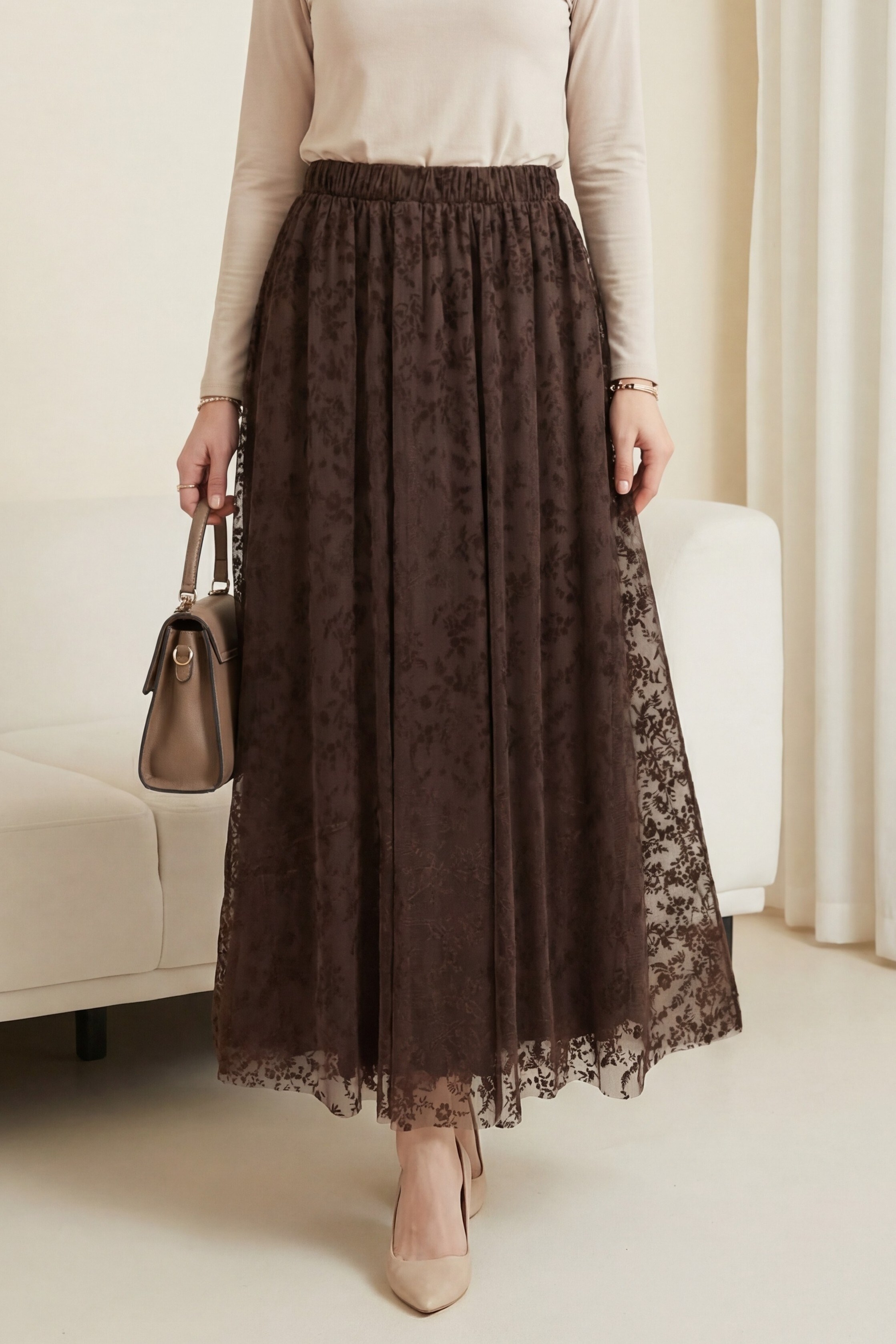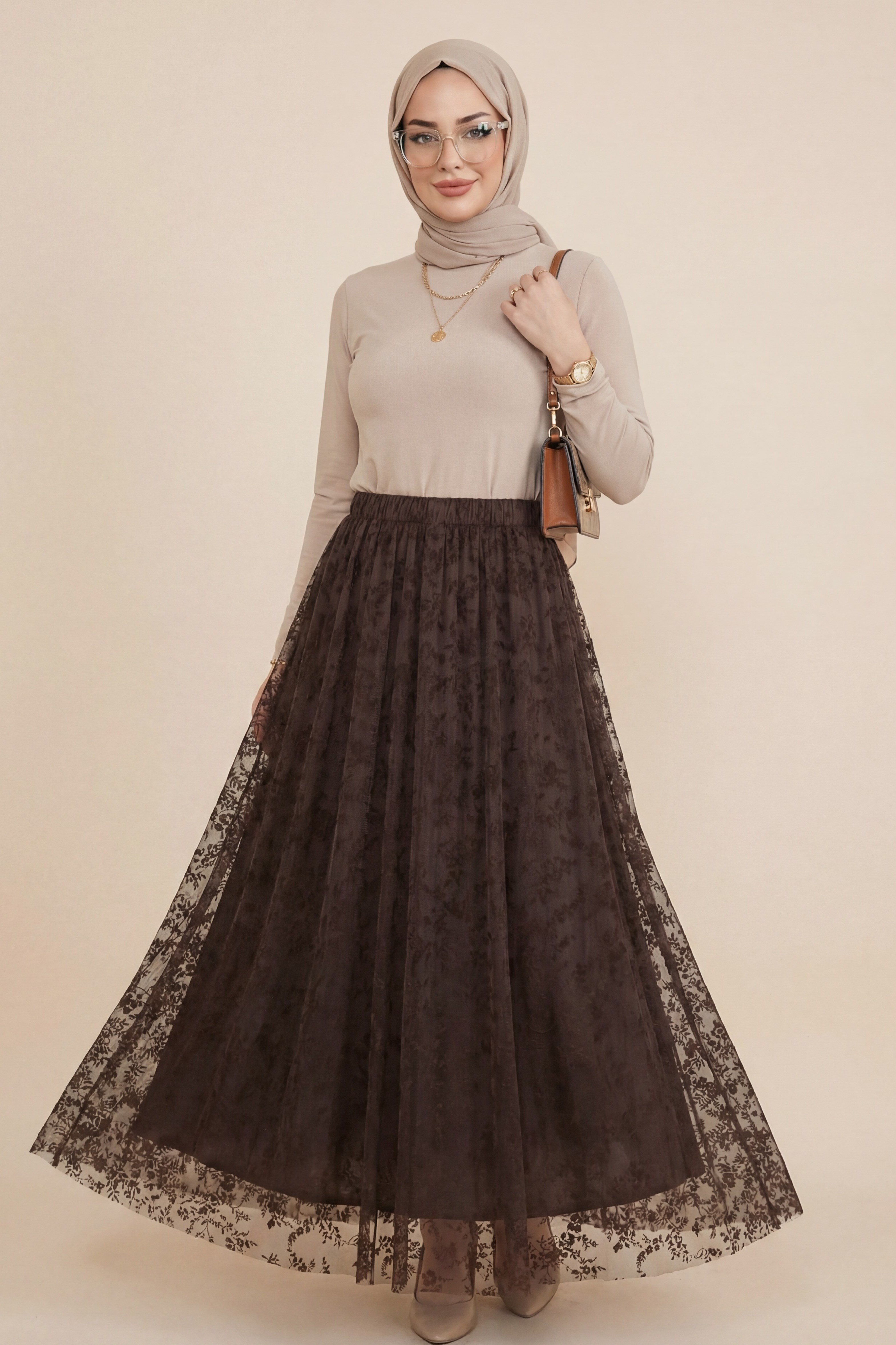 Beli Lastikli Flog Baskılı Astarlı Tül Etek -K. Kahve (349-8064-R54)