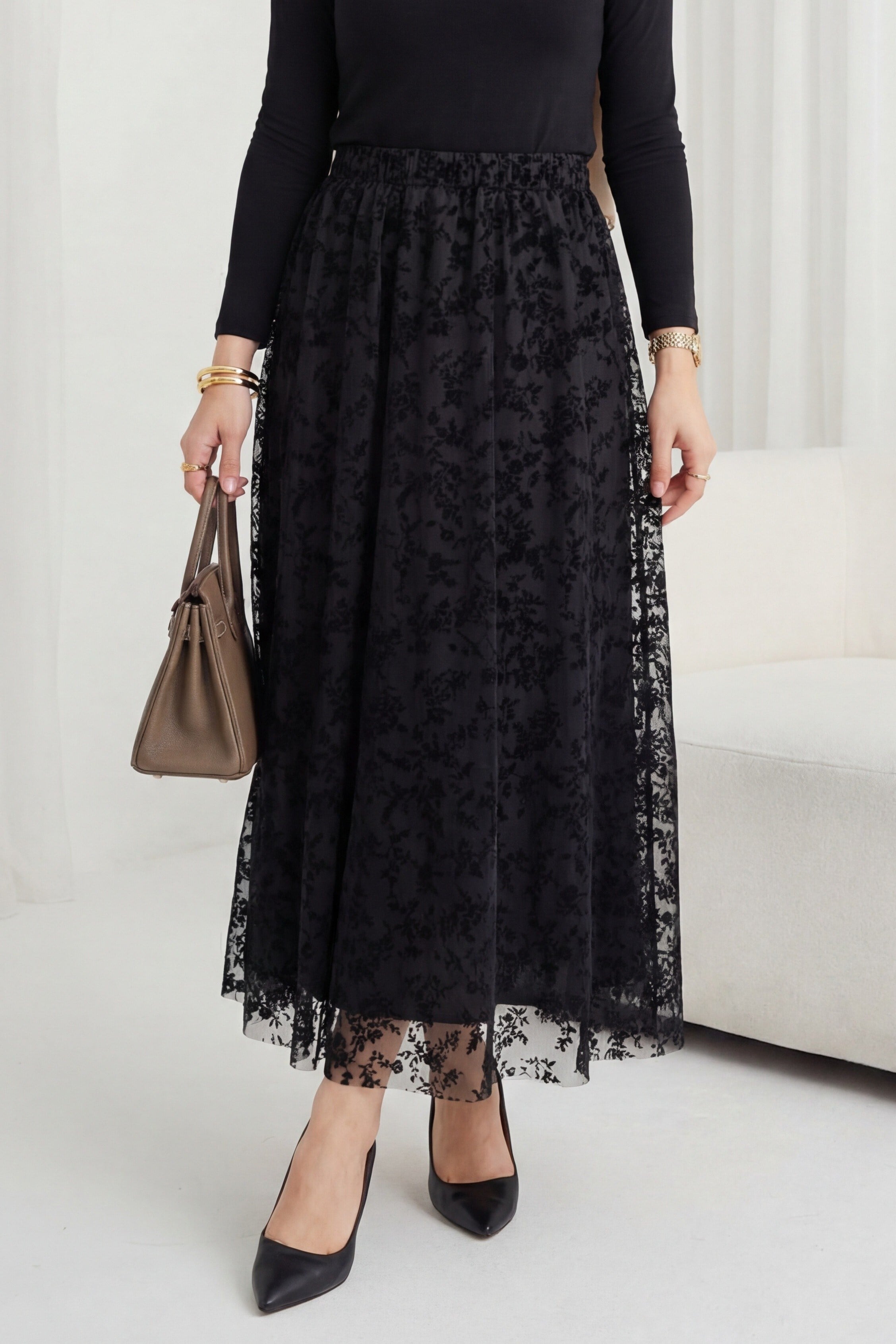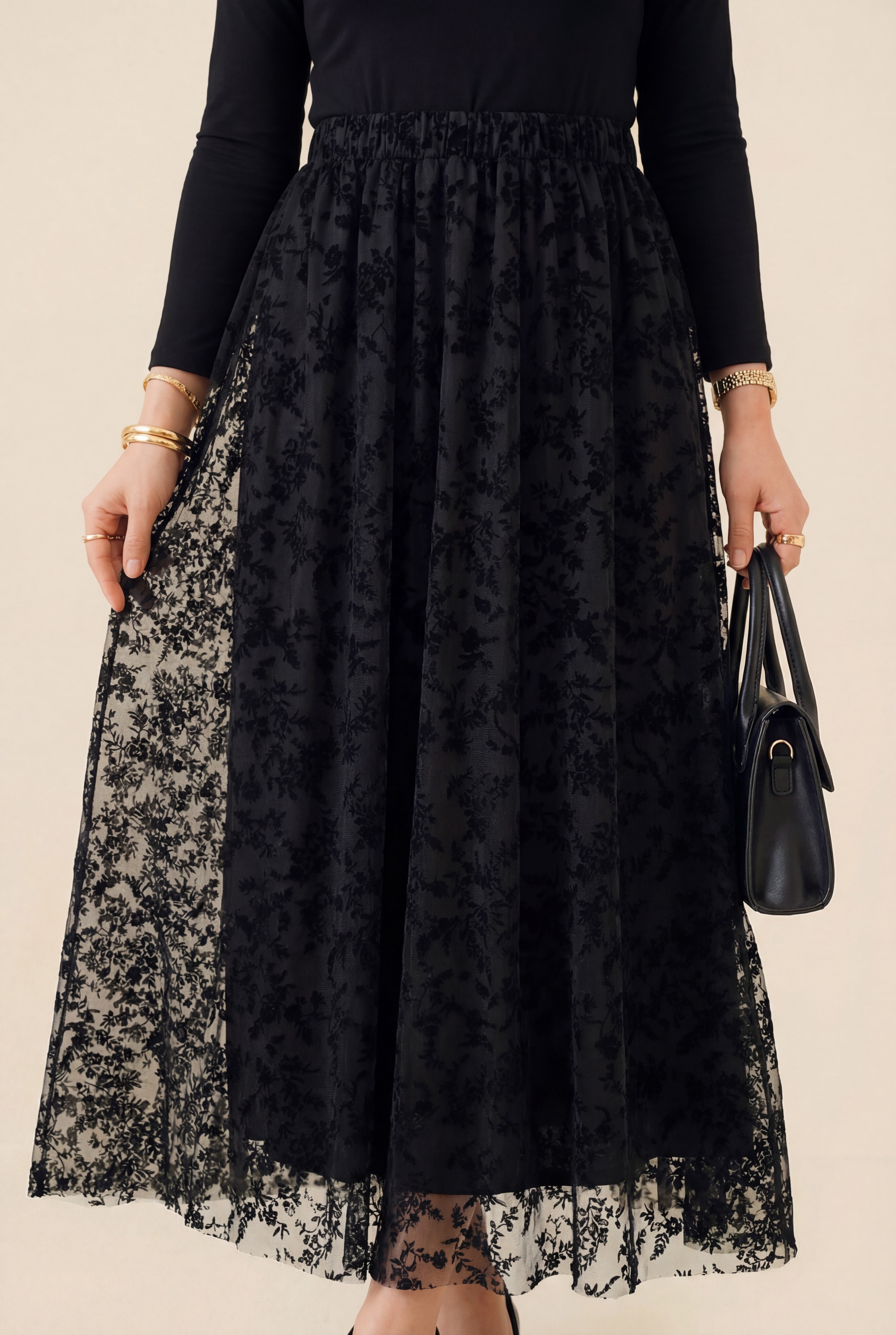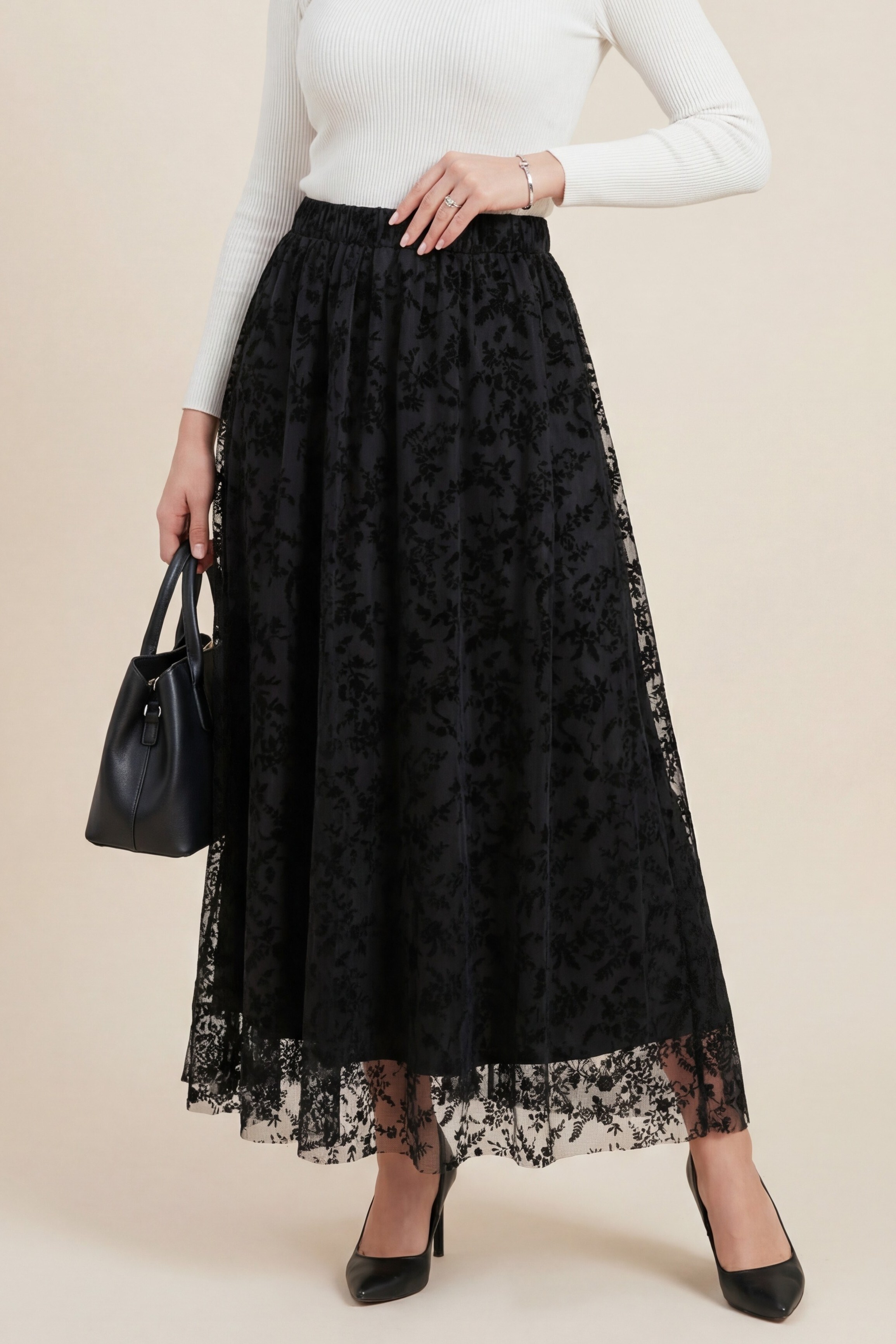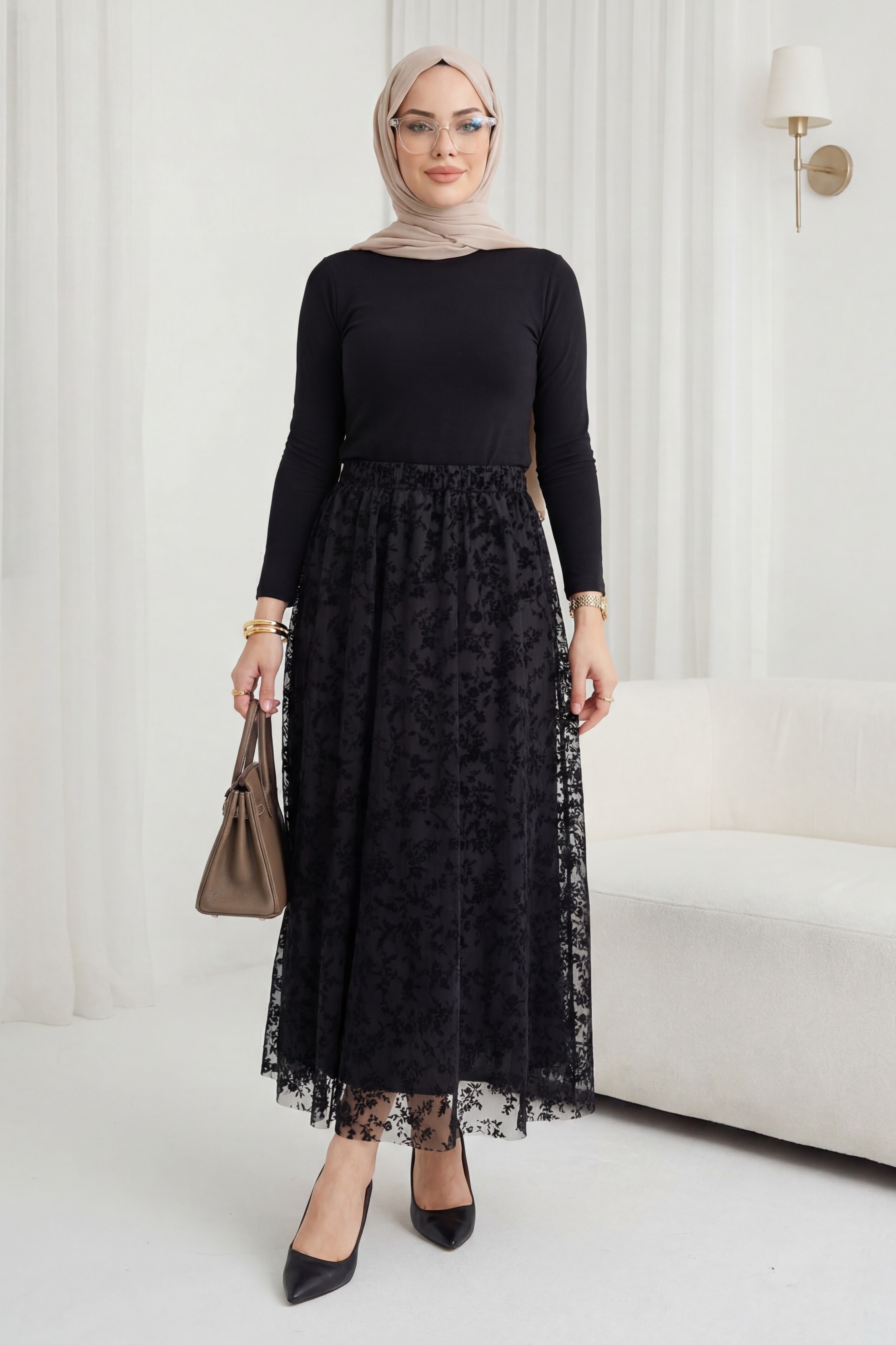 “flog baskılı tül etek”, “beli lastikli kadın etek”, “astarlı şık etek”, “modern etek modeli” gibi adlandırılabilir.
