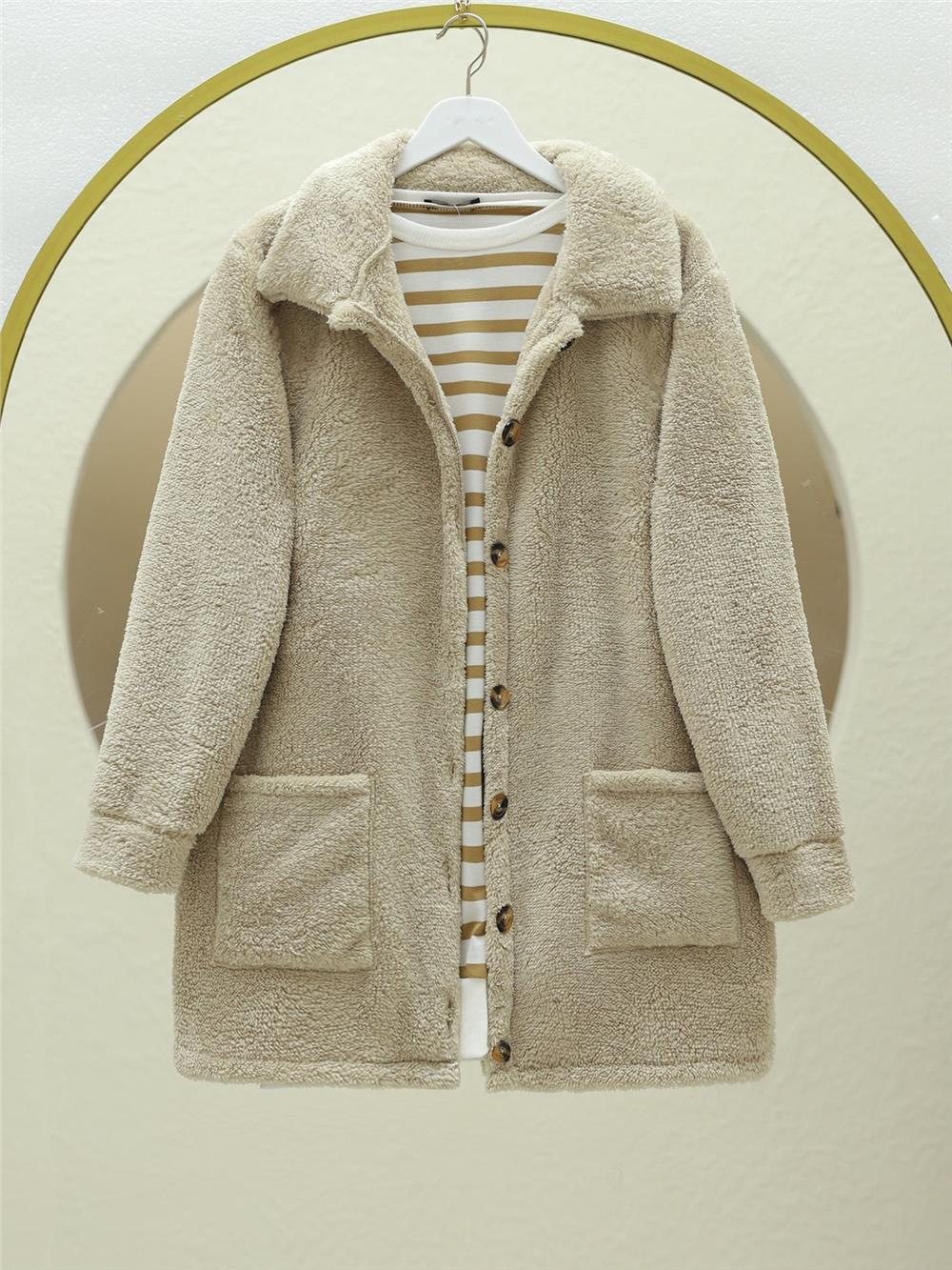 Boydan Düğmeli Cepli Pelüş Ceket, soğuk havalarda gardırobunuzun vazgeçilmez parçalarından biri olacak. Hem rahatlık hem de şıklık arıyorsanız, bu ürün tam size göre!