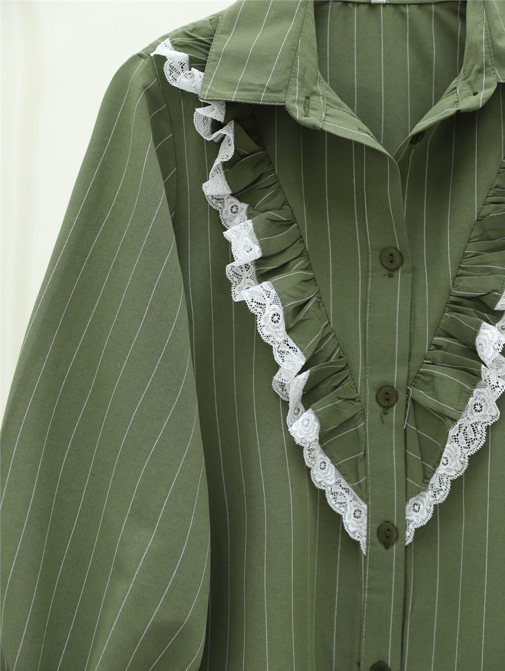 Boydan Düğmeli Önü Dantelli Fırfırlı Çizgili Gömlek -Haki (102-2102-R05)
