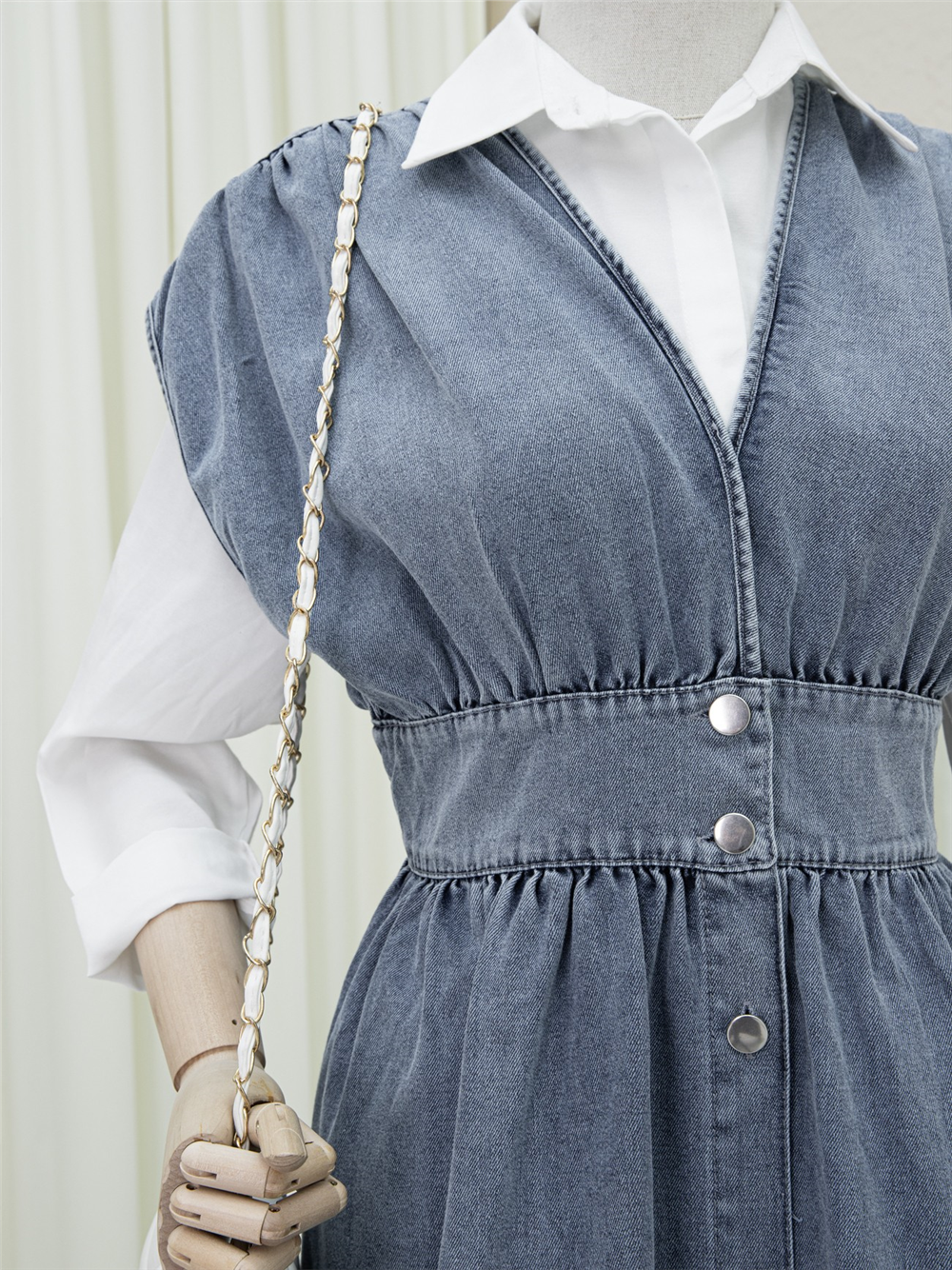 Bu yazlık kot jile, zarif V yaka kesimi ve baştan aşağı uzanan düğme detayıyla dinamik bir görünüm sunar. Sıfır kol yapısıyla yaz sıcaklarında serin kalmanızı sağlarken, farklı bluz veya tişörtlerle kolayca kombinlenebilir. %70 Pamuk ve %30 Polyester karışımı kot kumaşı sayesinde hem dayanıklı hem de üzerinizde konforlu bir his bırakır.