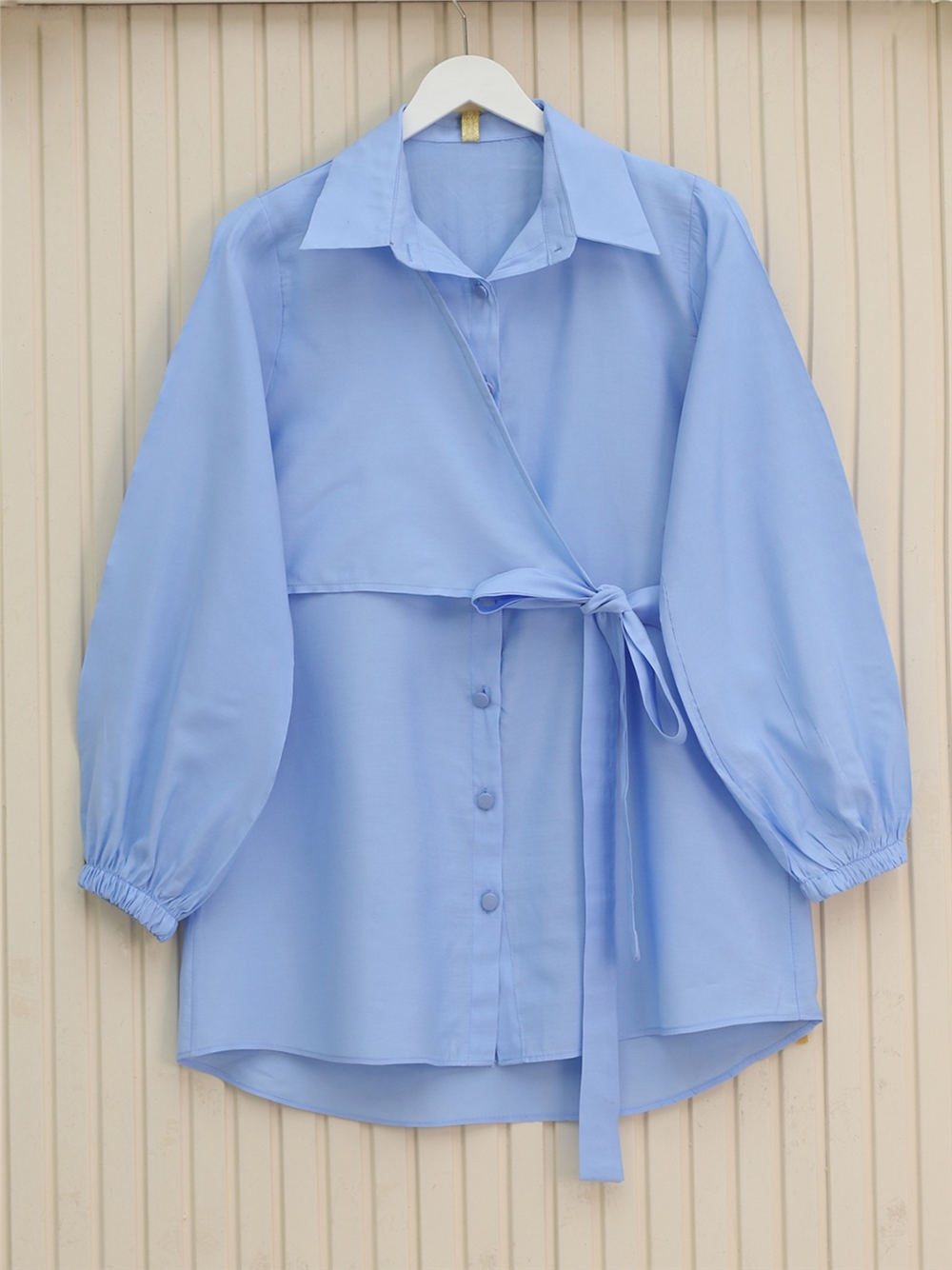 Çapraz Bağlamalı Kolu Lastikli Düğmeli Gömlek -Bebe Mavi (398-1041-R32)