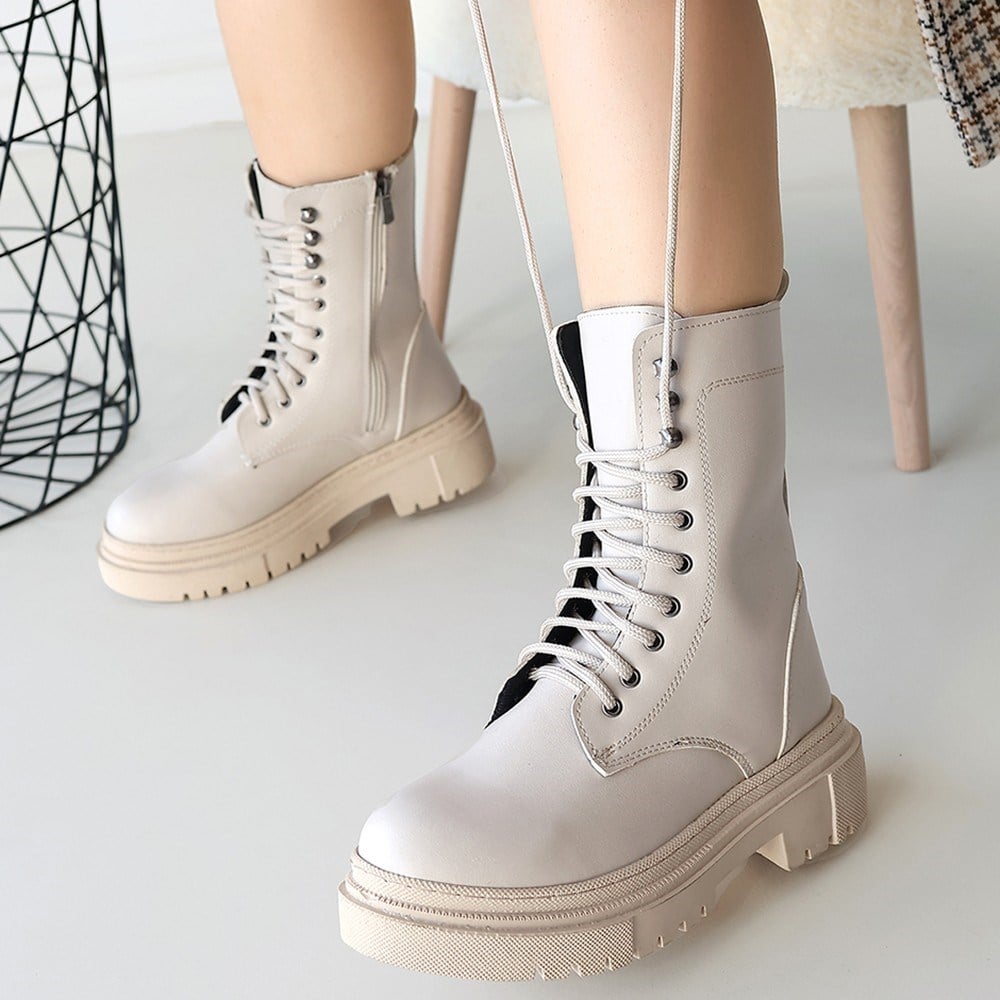 Caxa Cilt Bağcıklı Bot -Bej modeli, kadın bot kategorisinde, bej rengiyle soğuk havalarda hem şıklık hem de fonksiyonellik arayanlar için uygun bir seçenektir.