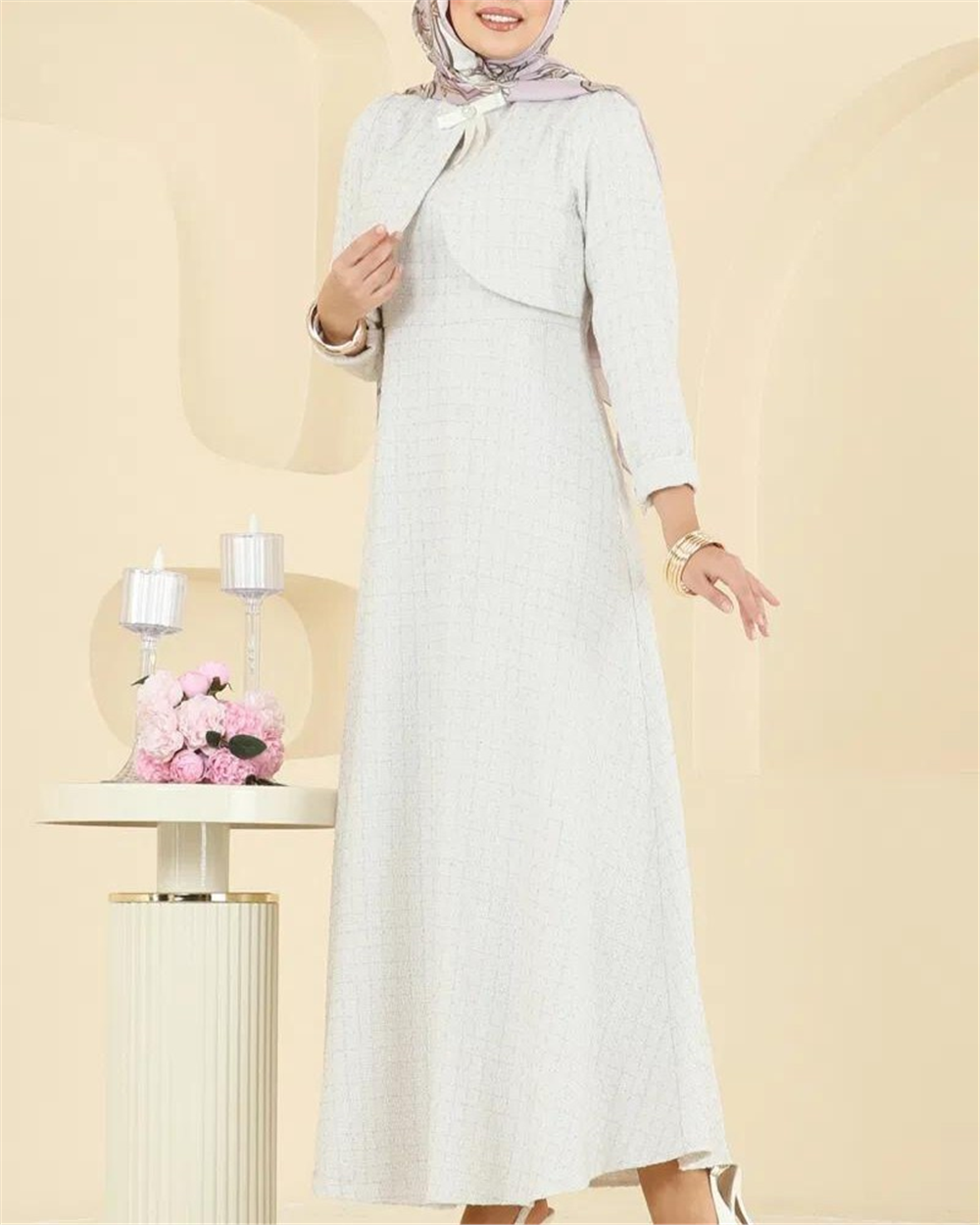 Ceket Detaylı Simli Broşlu Elbise -Ekru (386-6251-R07)