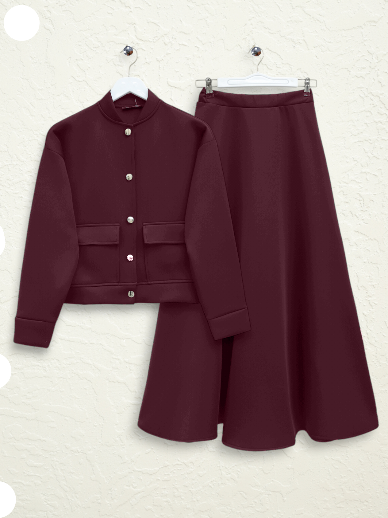 Çift Cepli Metal Düğmeli Etekli Takım -Bordo (349-6043-R04)