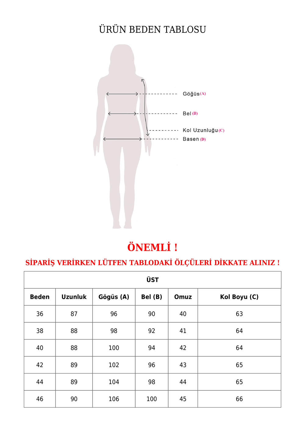 Beden seçenekleri: 36, 38, 40, 42, 44, 46.