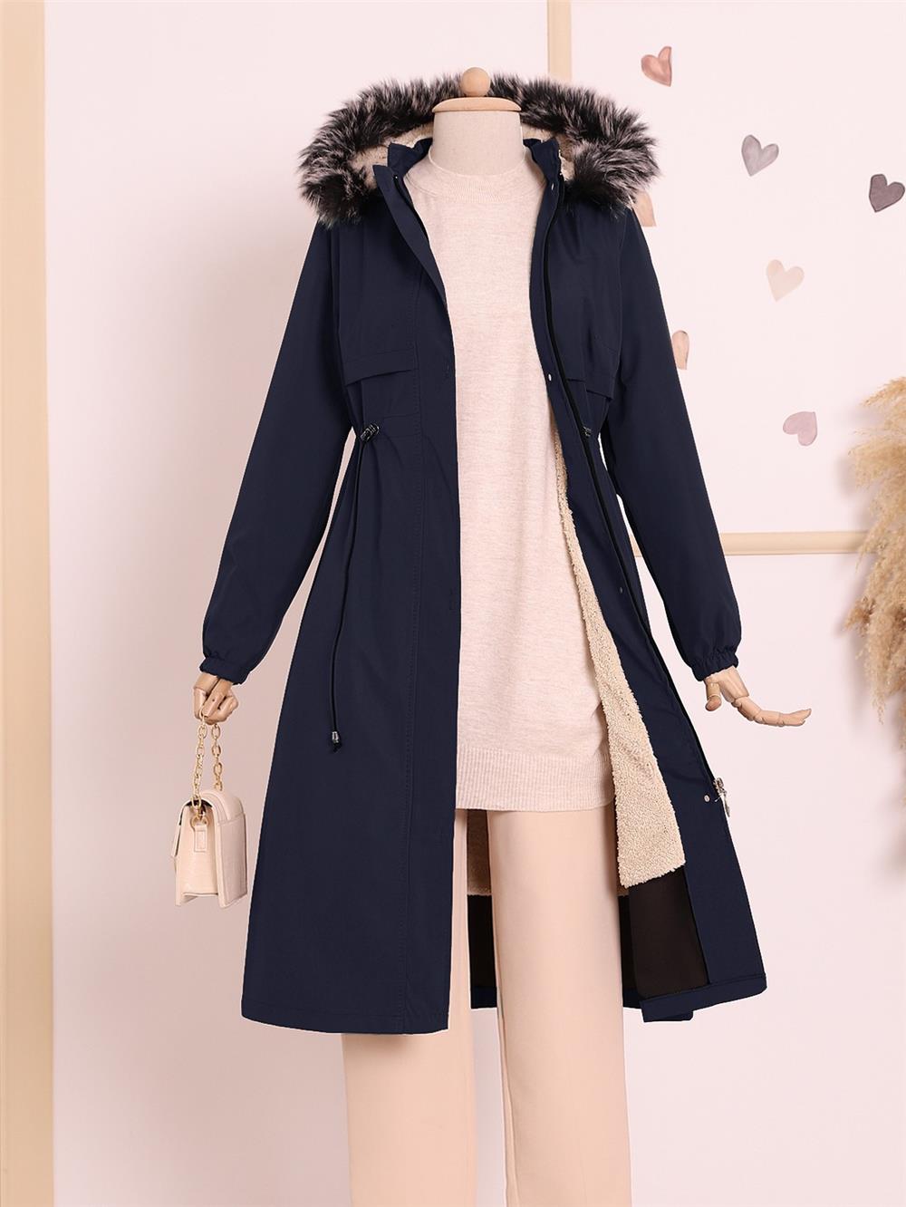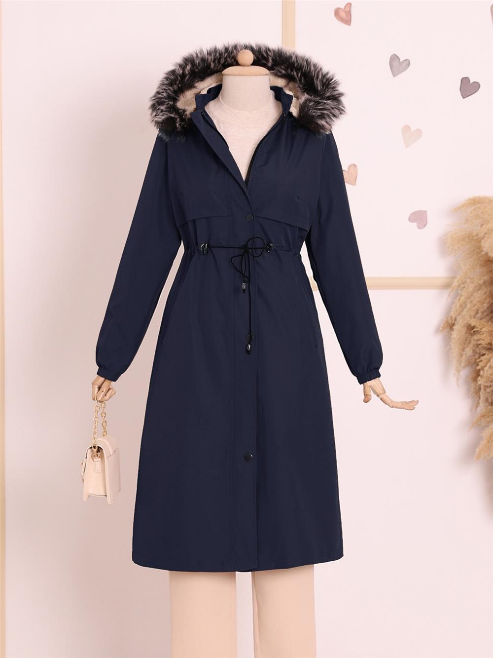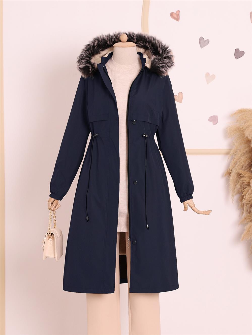 Tünel Bağcıklı Çıkma Kapşonlu Lacivert Bondit Kaban