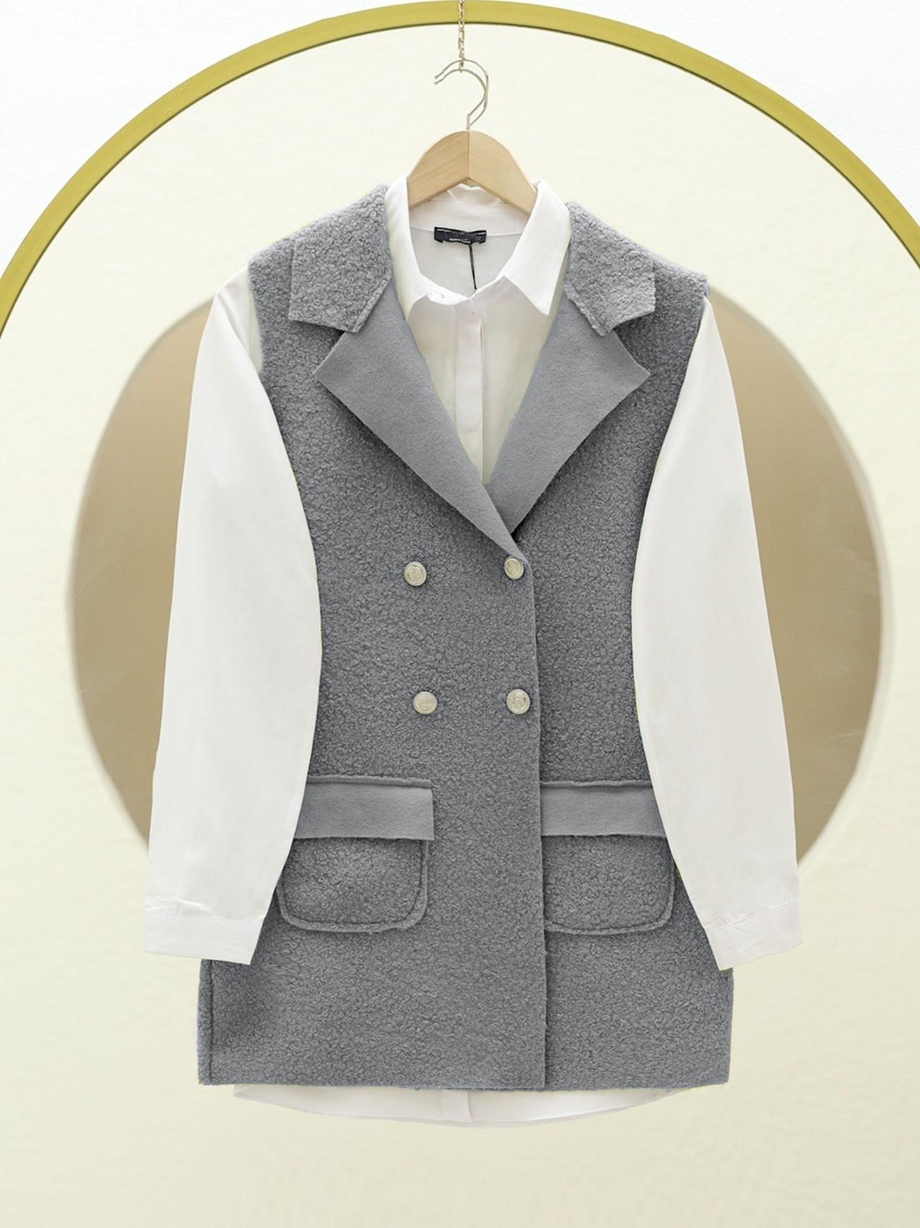 Düğmeli Çift Cepli Buklet Yelek -Füme (349-6041-R18)