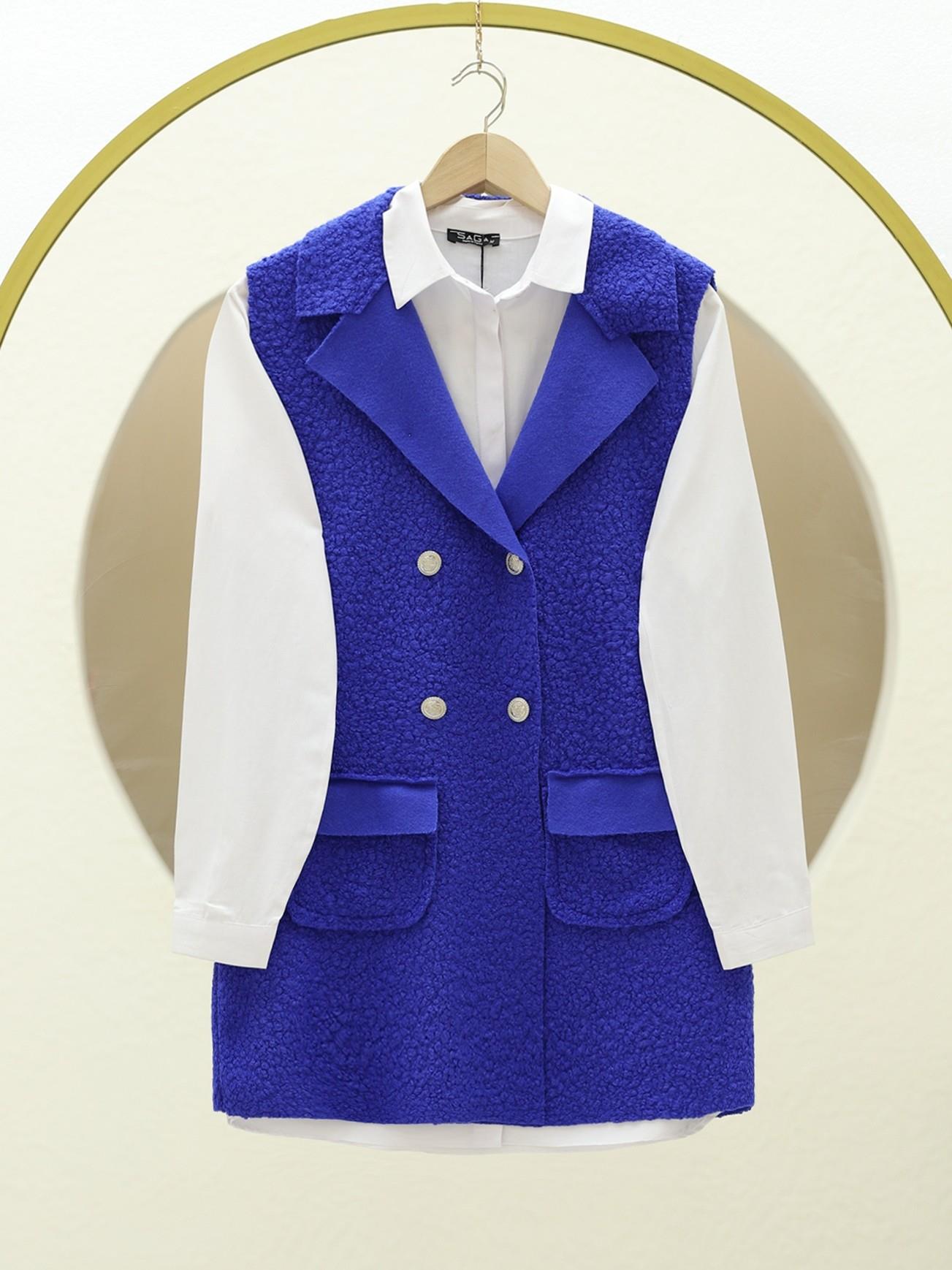 Düğmeli Çift Cepli Buklet Yelek -Saks (349-6041-R10)