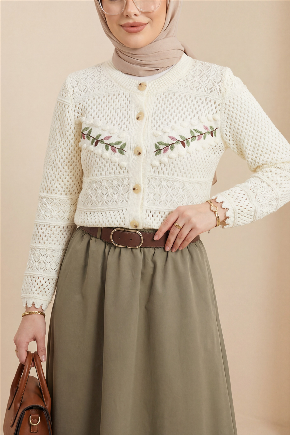 Düğmeli Önü Nakışlı Ajurlu Triko Hırka, zarif ve romantik bir stil sunar. Ön kısmındaki nakış detayları tasarıma şık bir dokunuş katarken, ajurlu triko dokusu hareketli bir görünüm sağlar. Düğmeli formu klasik bir duruş kazandırır. Yumuşak ve konforlu yapısı sayesinde günlük kombinlerde kolayca tercih edilir.