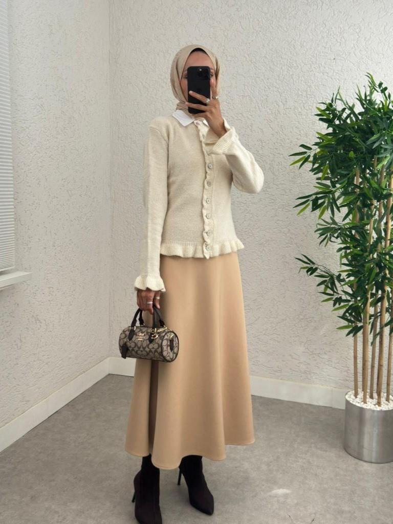 Düğmeli Önü Ve Eteği Fırfırlı Hırka -Taş (307-43478-R43)