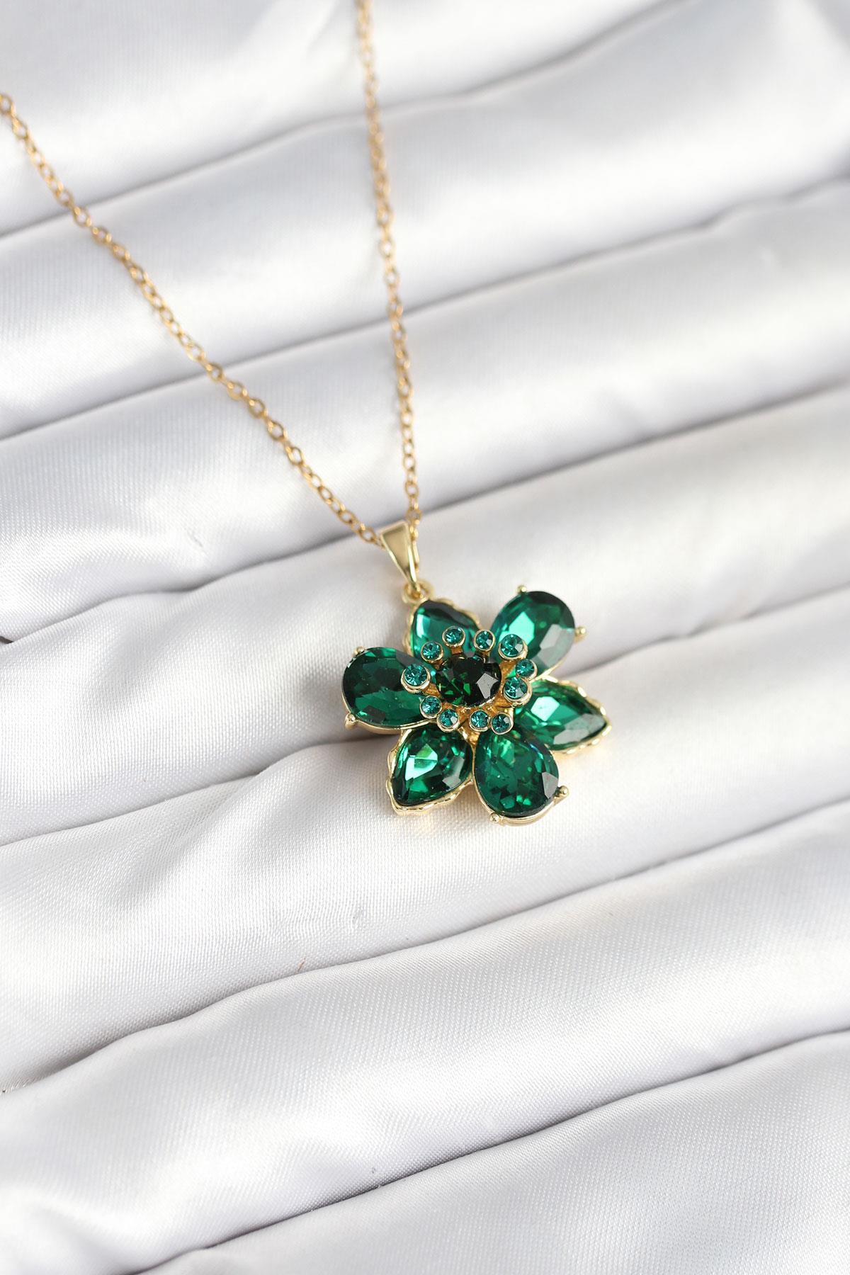 316L Çelik Zincirli Yeşil Çiçek Model Kadın Kolye (BKO10596)
