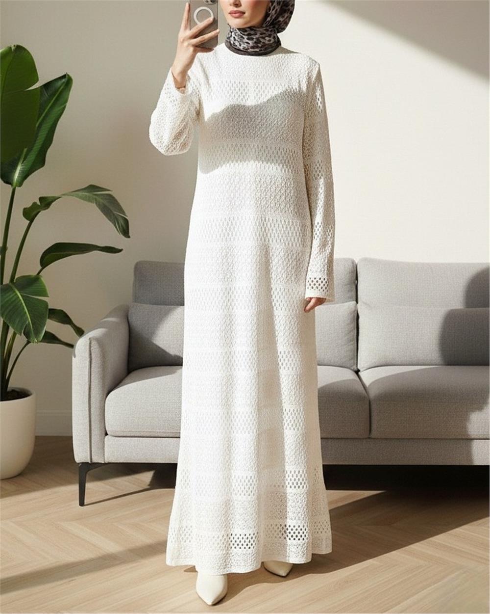 Ajurlu Karışık Desenli İçlikli Triko Elbise -Ekru (109-0926-R07)