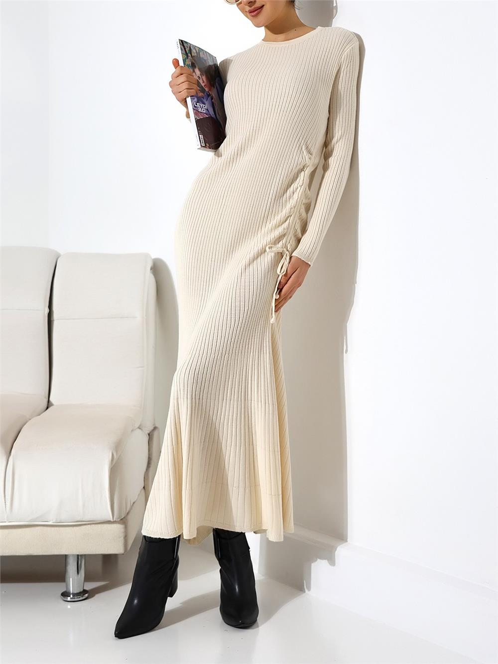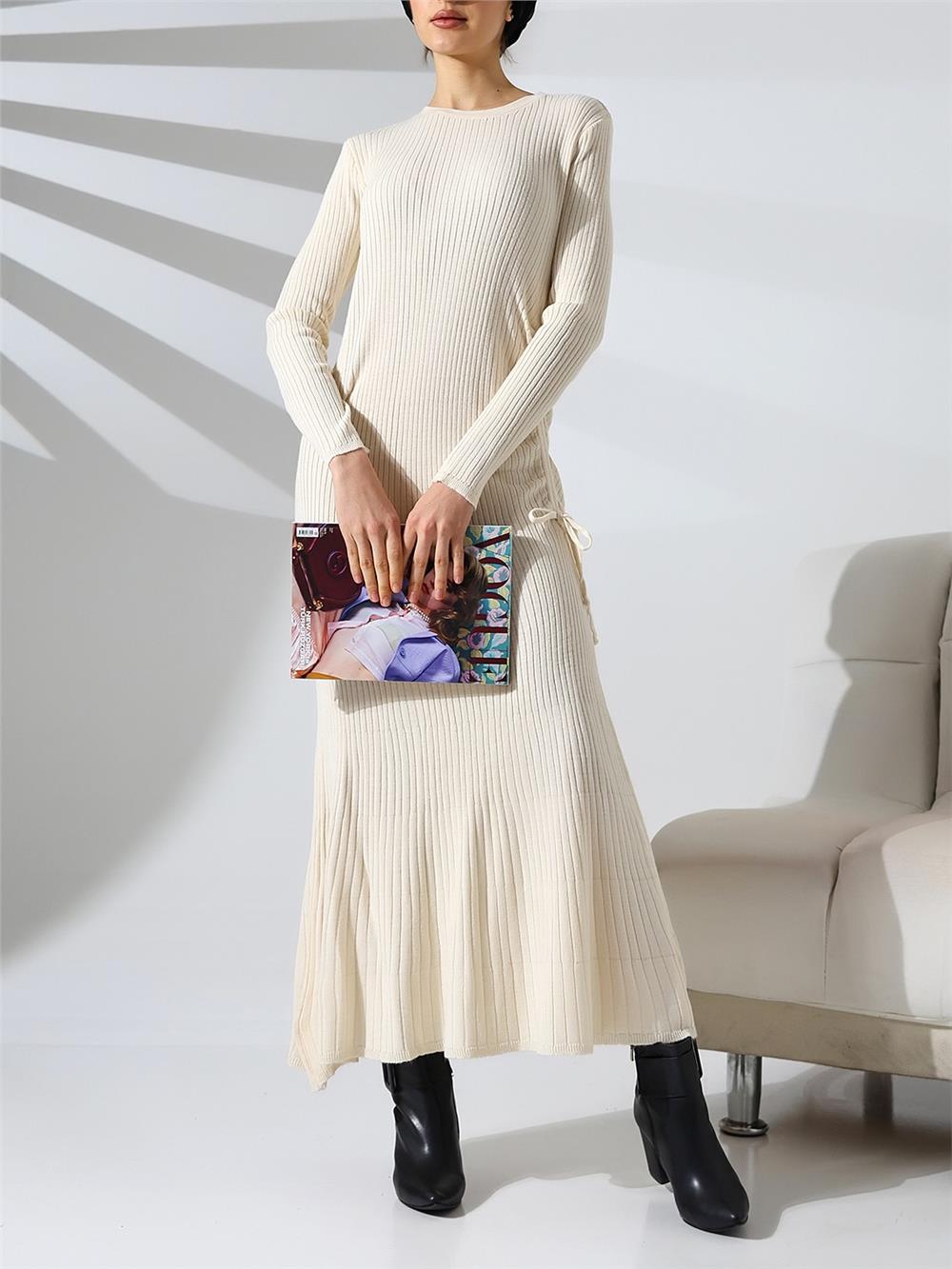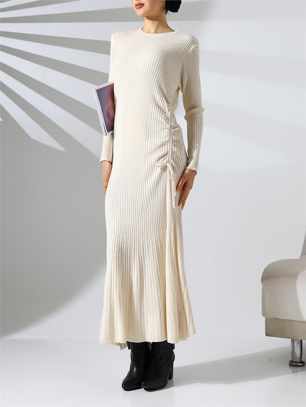 Belden Büzgülü Balık Triko Elbise -Ekru (346-14507-R07)