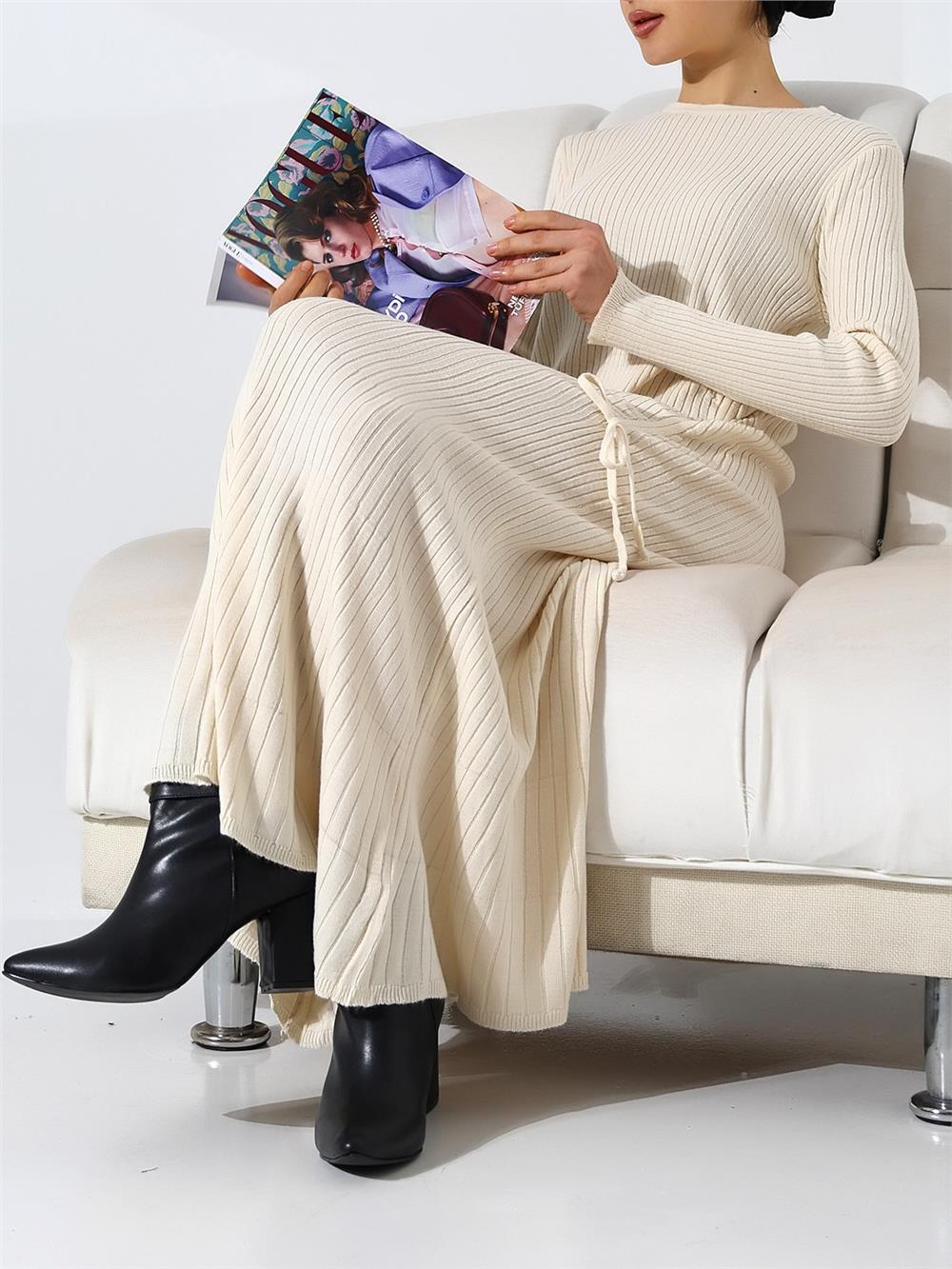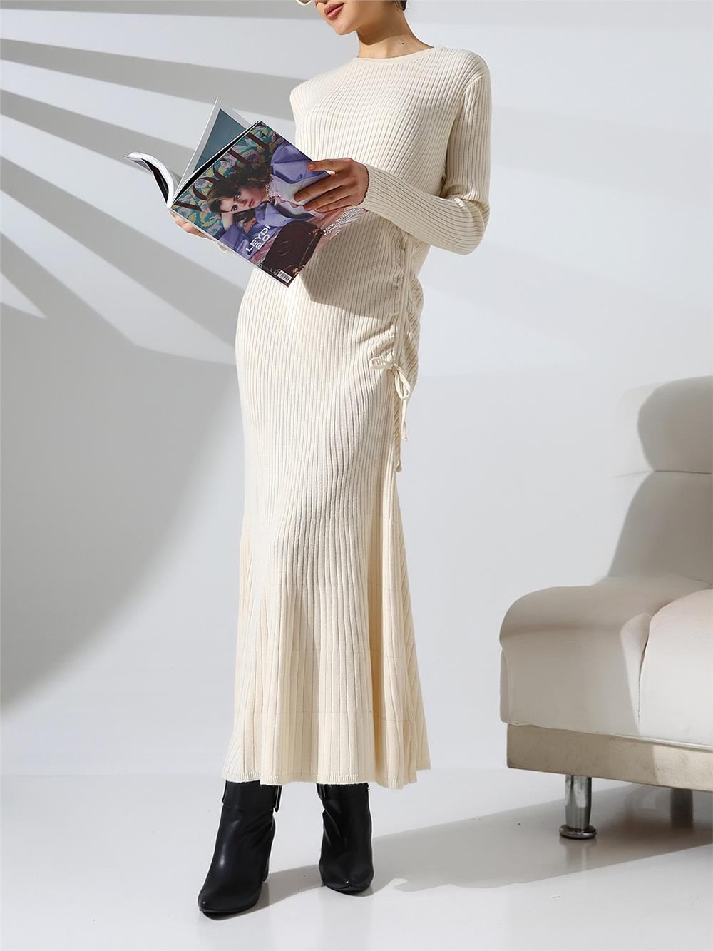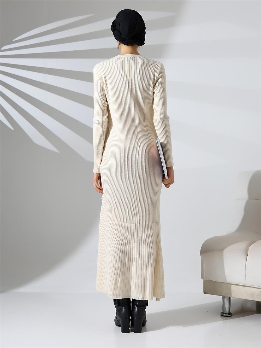 Belden Büzgülü Balık Triko Elbise -Ekru (346-14507-R07)