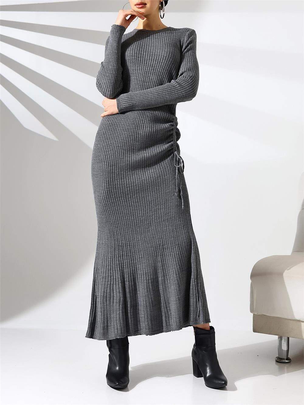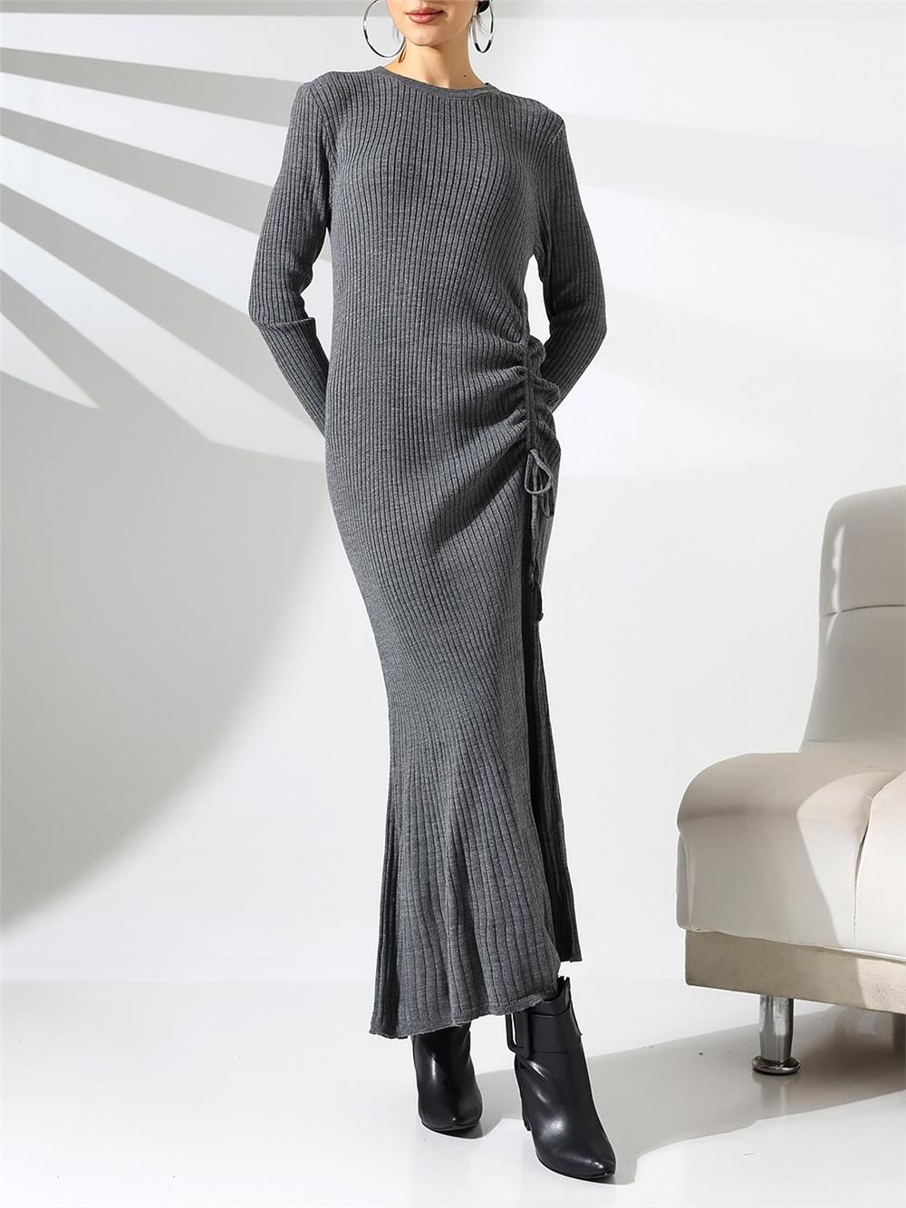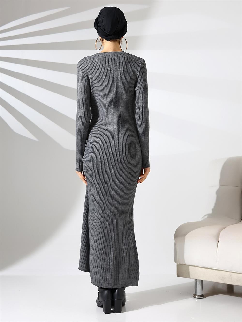 Belden Büzgülü Balık Triko Elbise -Füme (346-14507-R18)