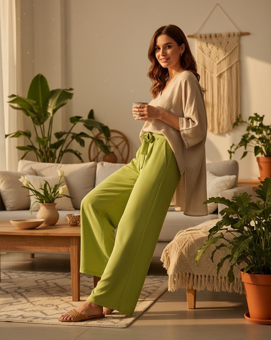 Our wide-leg trousers model with elastic waistband and lacing has taken its place among the most trendy models of the new season.