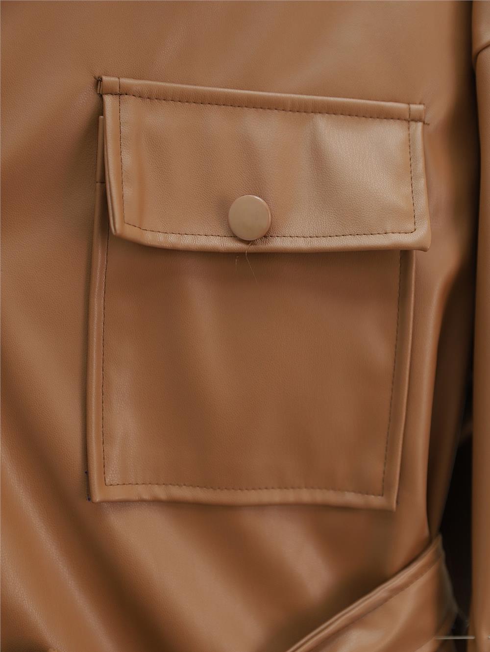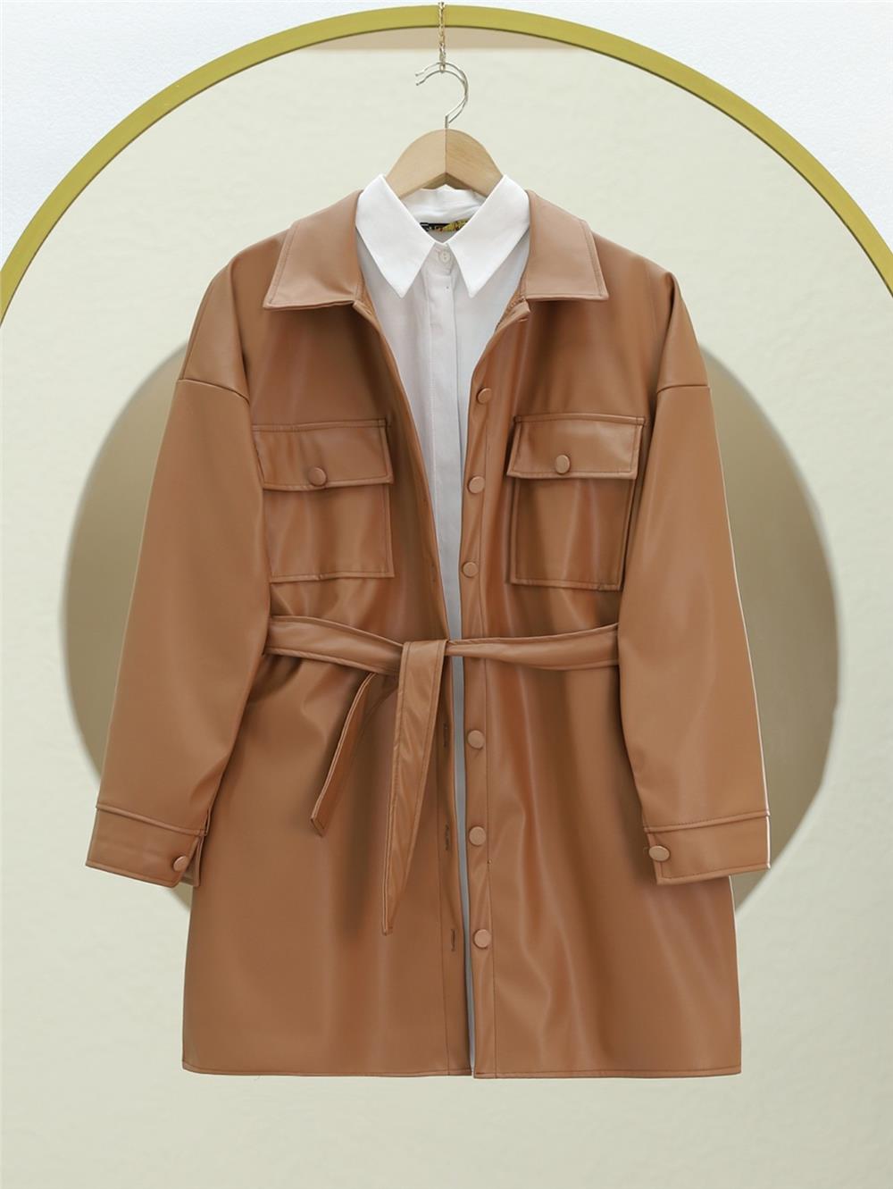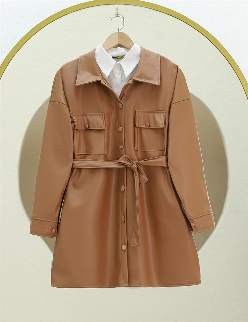 Beli Bağlamalı Çift Cepli Deri Gömlek -Taba (398-5099-R12)