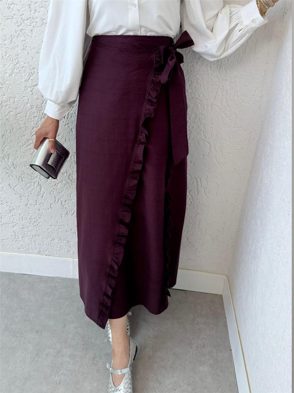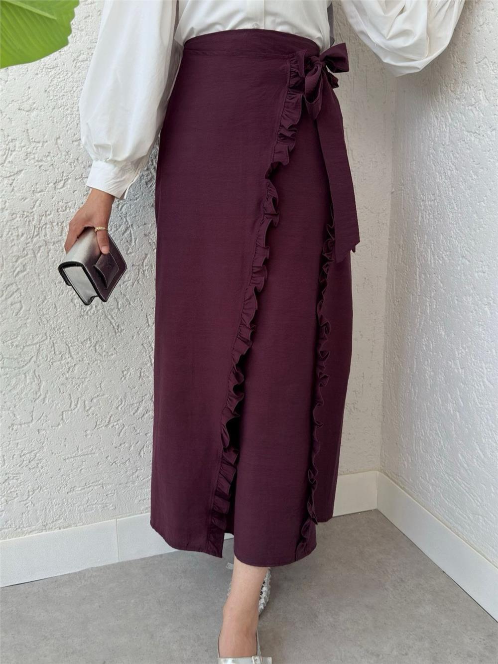 Beli Bağlamalı Çift Kat Yırtmaçlı Fırfırlı Etek -Mürdüm (307-2325-R09)
