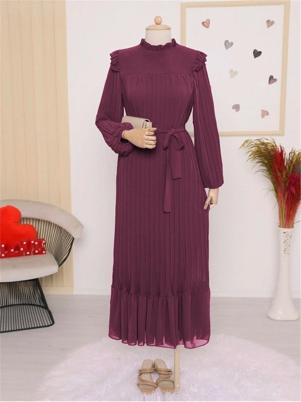 Beli Bağlamalı Kolu Lastikli Eteği Parçalı Şifon Elbise -Bordo (413-10051-R04)