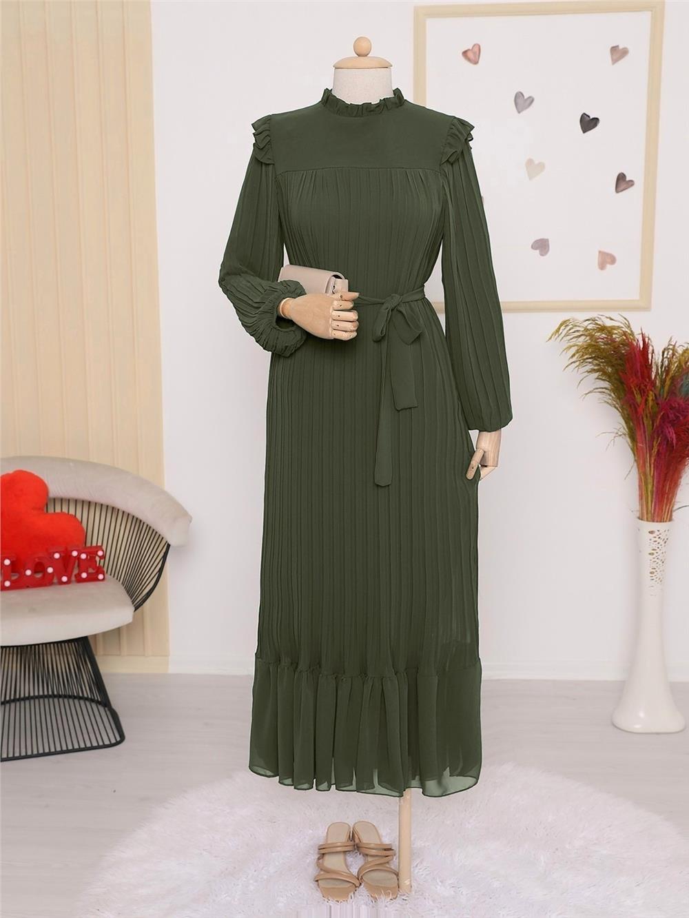 Beli Bağlamalı Kolu Lastikli Eteği Parçalı Şifon Elbise -Haki (413-10051-R05)