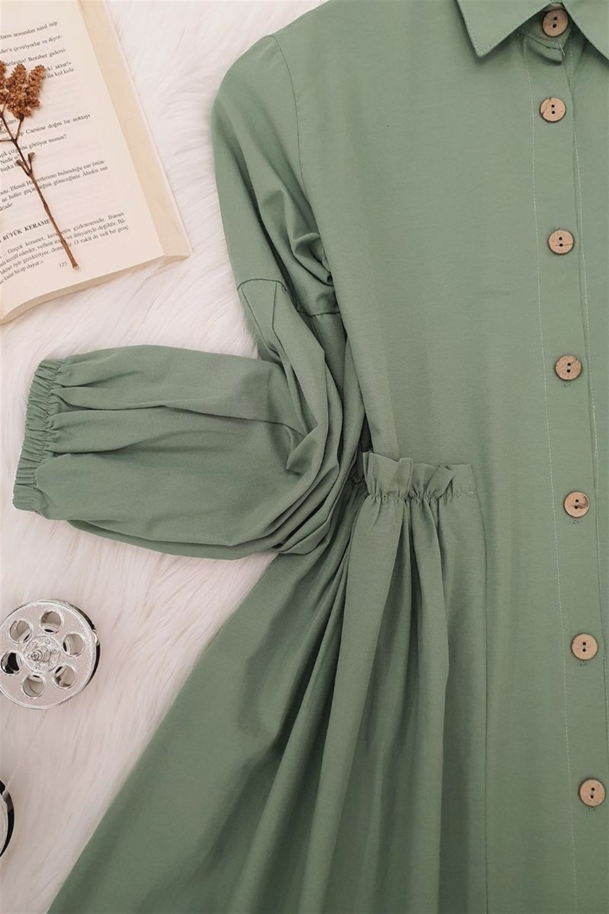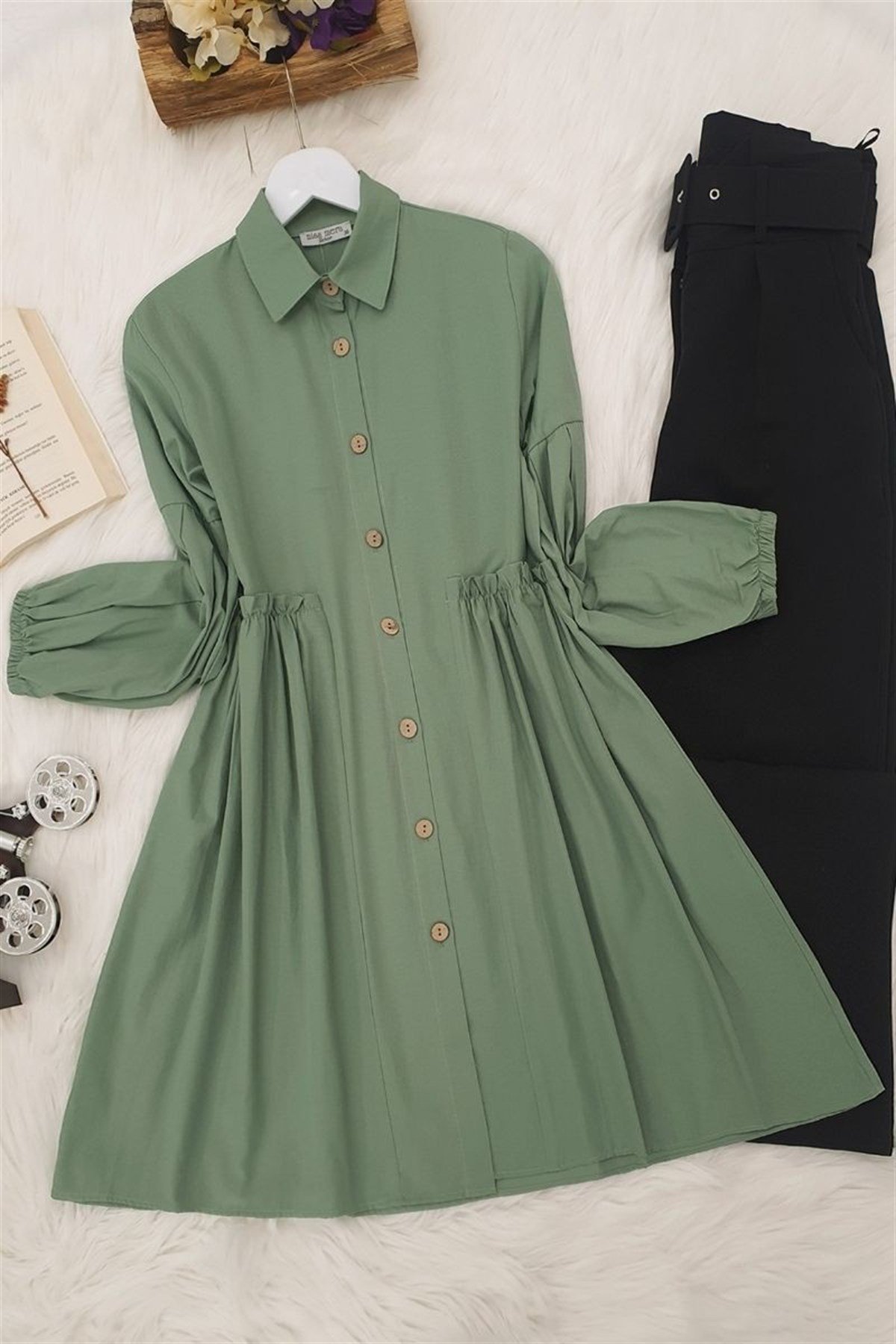 Beli Fırfırlı Yeşil Bayan Tesettür Gömlek