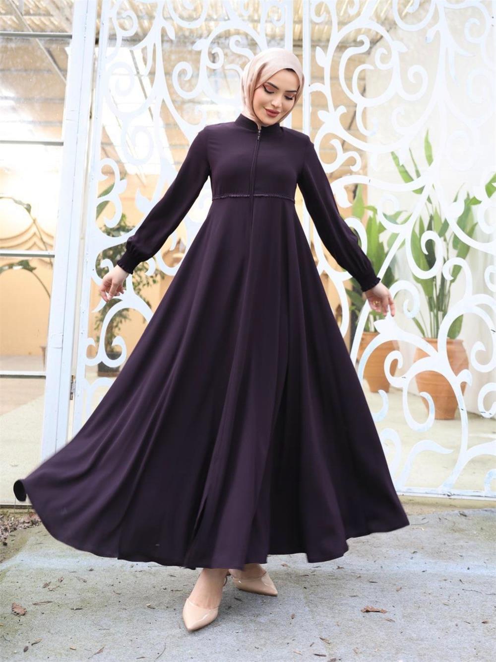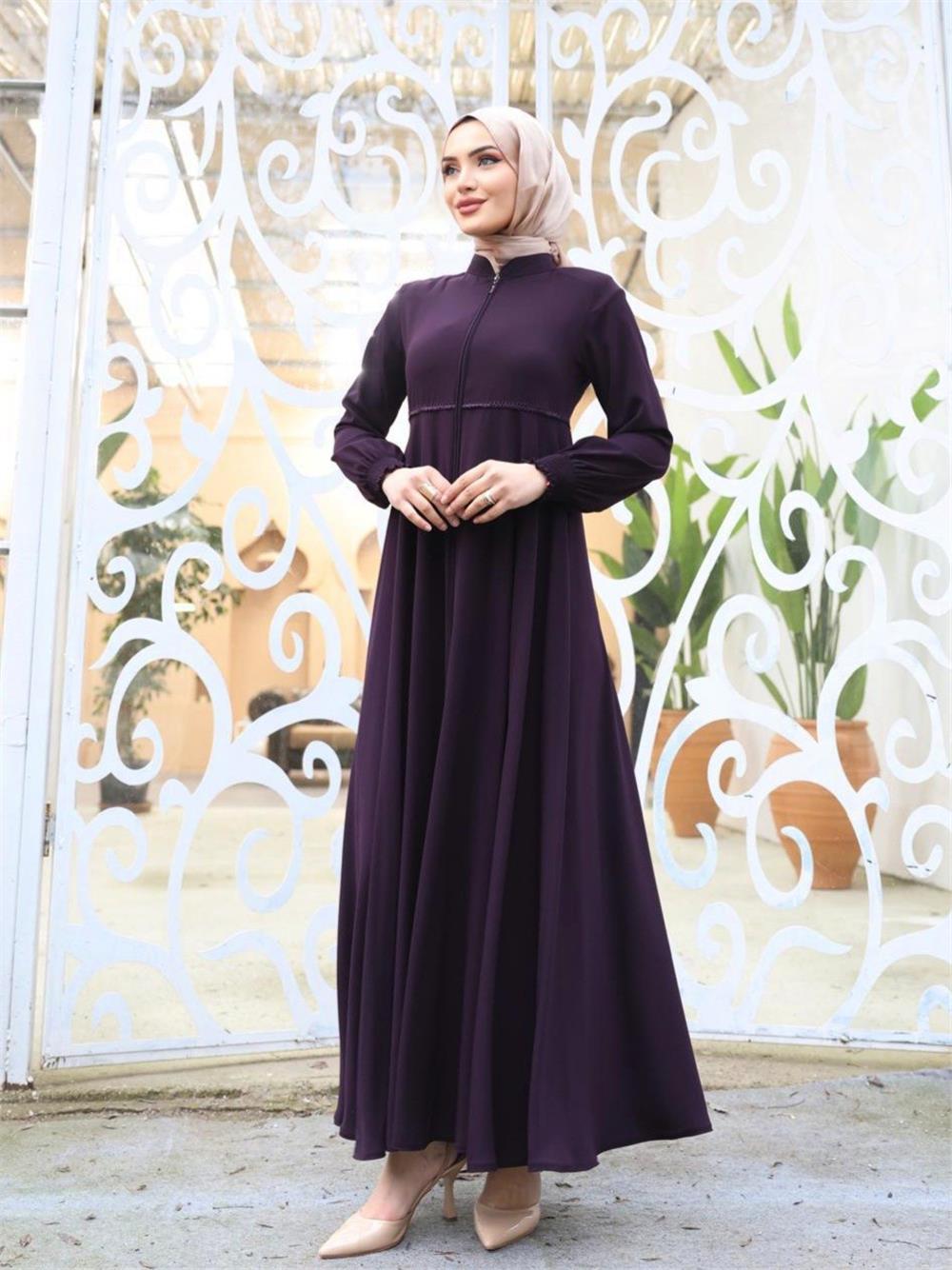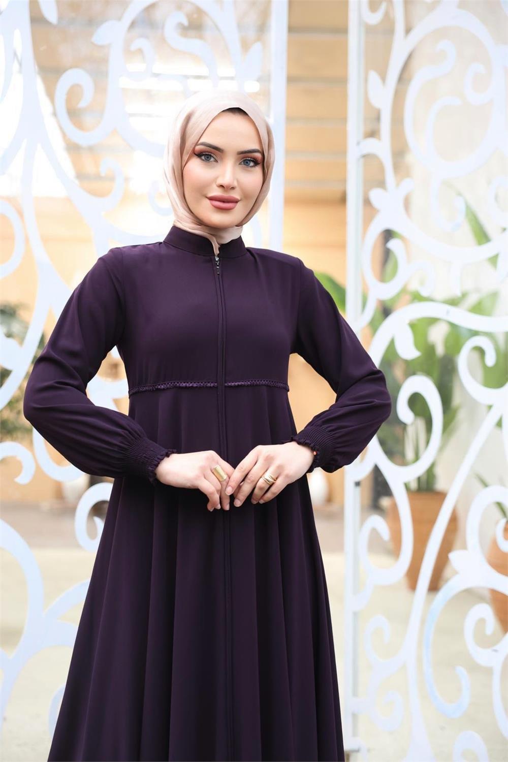 Beli Fistolu Omuzları Vatkalı Kolu Lastikli Ferace -Mor (412-3001-R34)