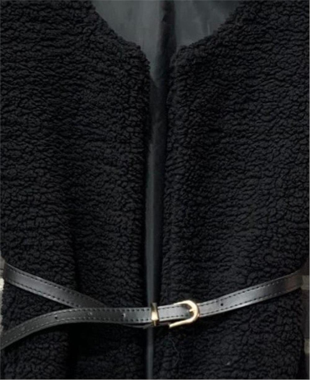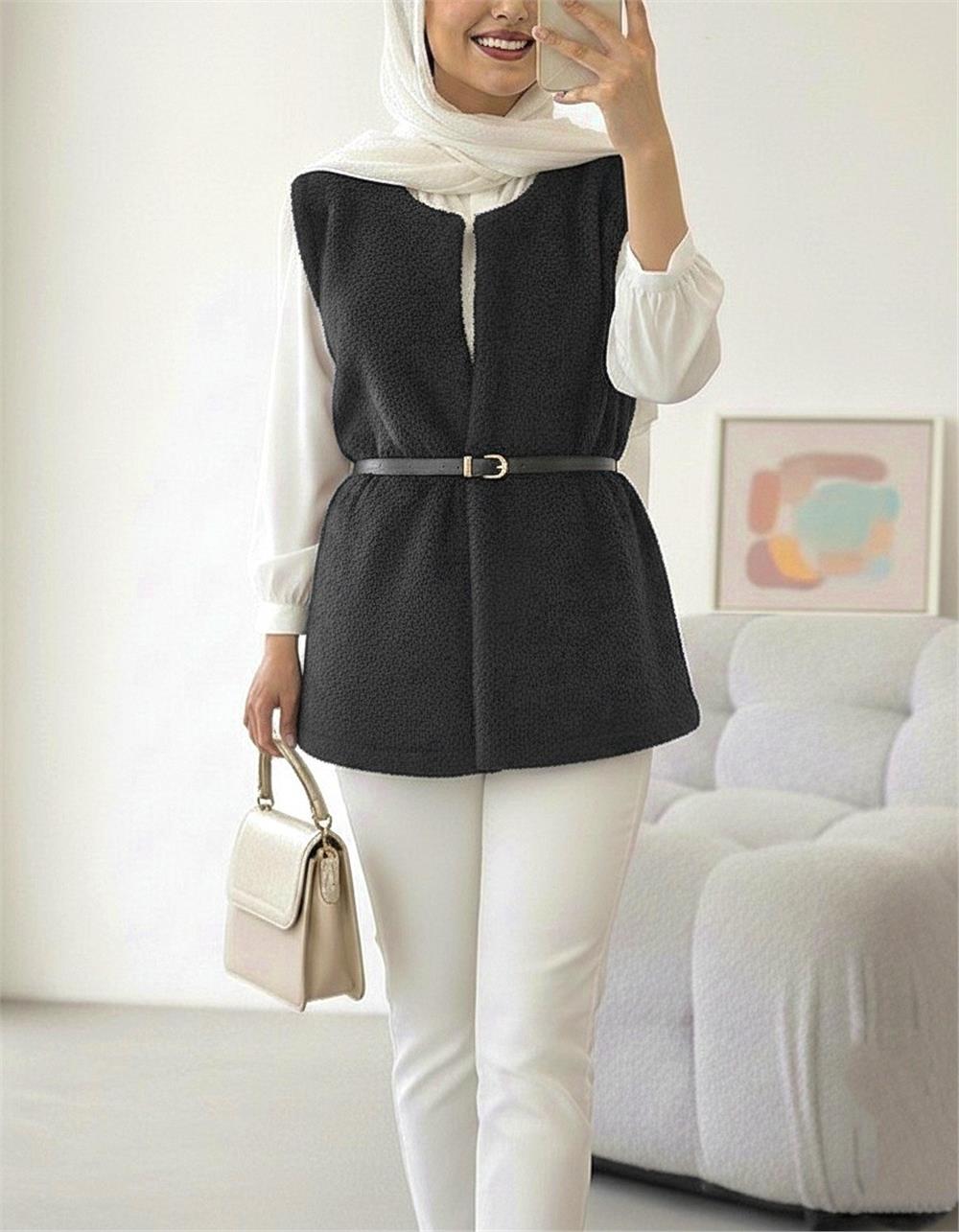 Beli Kemerli Çift Cepli Astarlı Peluş Yelek -Siyah (253-12974-R01)