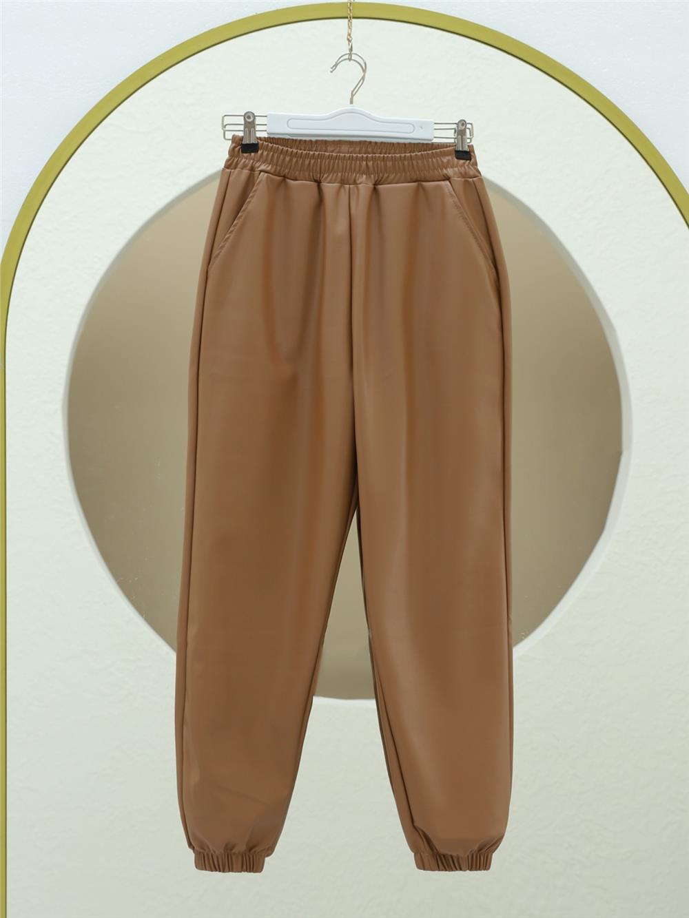 Beli ve Paçası Lastikli Cepli Deri Pantolon -Taba (398-7036-R12)