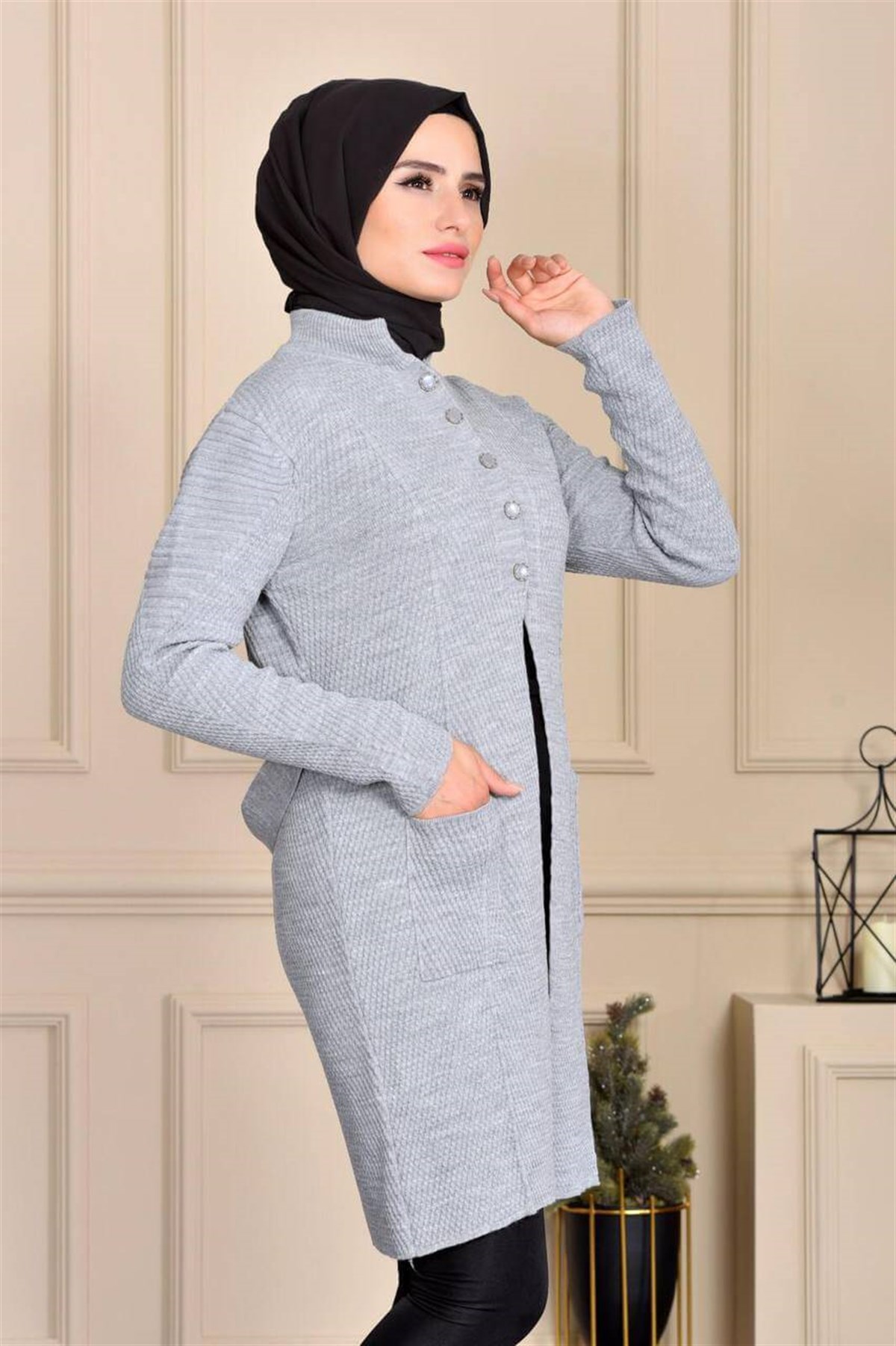 Beş Düğmeli Kemerli Triko Ceket -Açık Gri (1217-21442-R41)