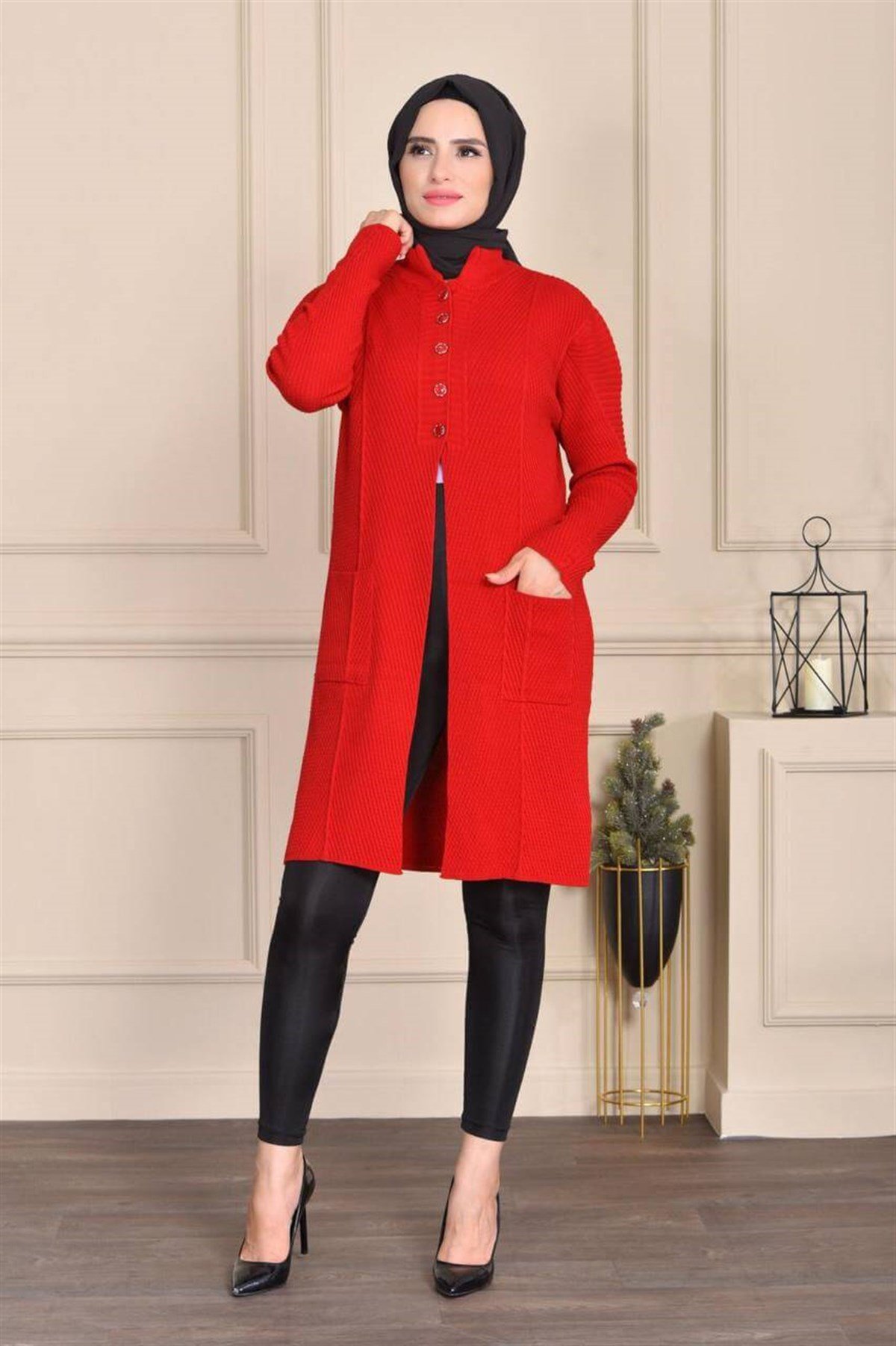 Beş Düğmeli Kemerli Triko Ceket -Kırmızı (1217-21442-R33)
