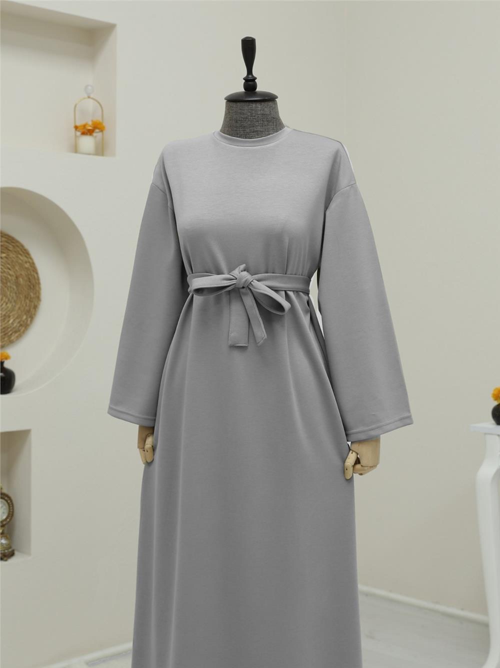 Bisiklet Yaka Beli Bağcıklı Elbise -Gri (253-12948-R11)