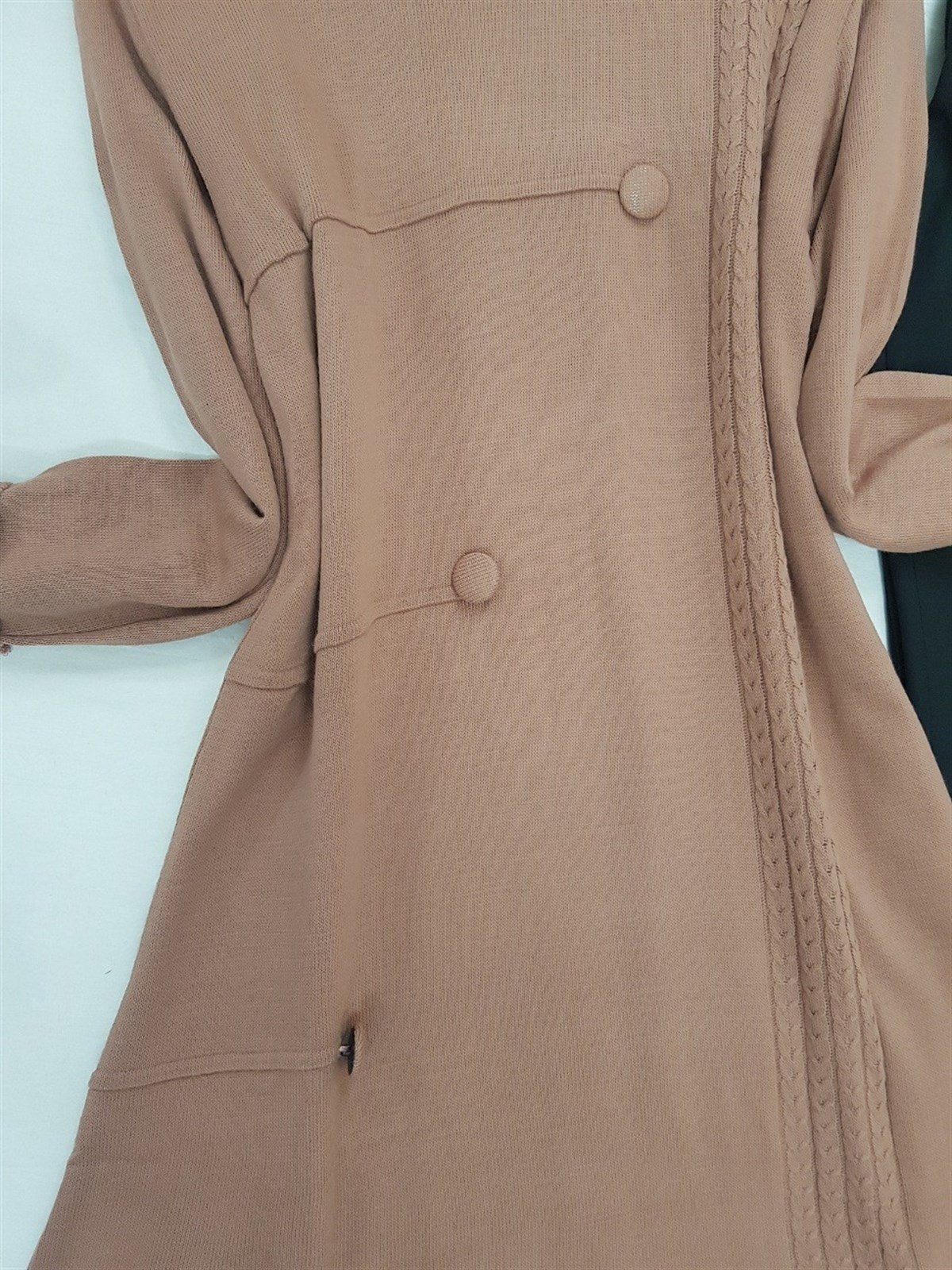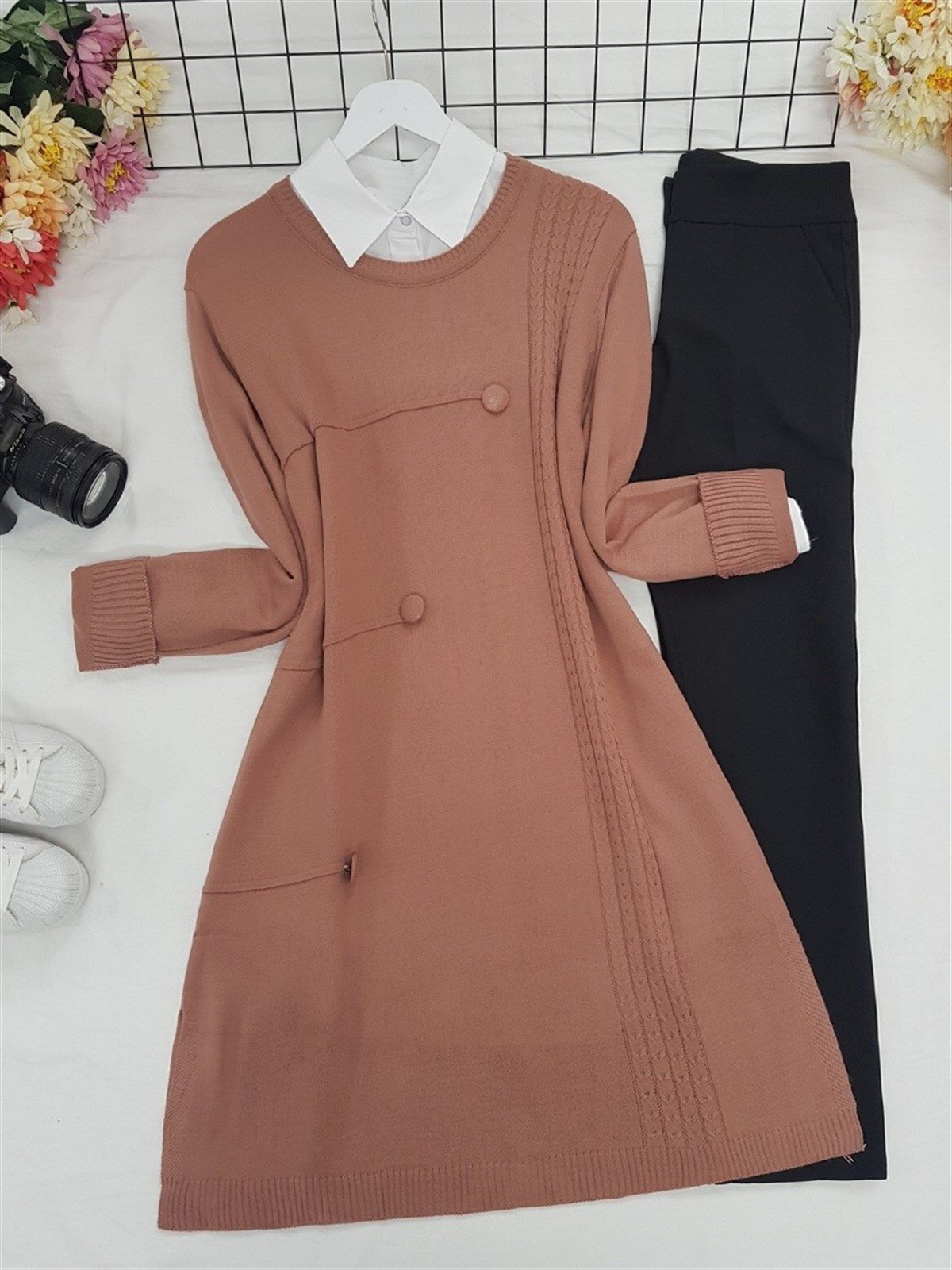 Bisiklet Yaka Düğme Detaylı Pudra Tesettür Triko Tunik