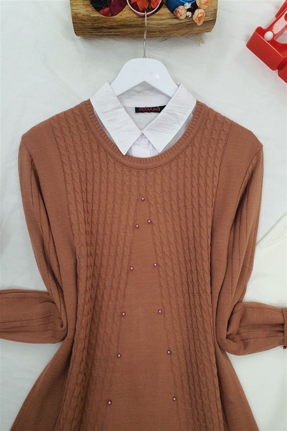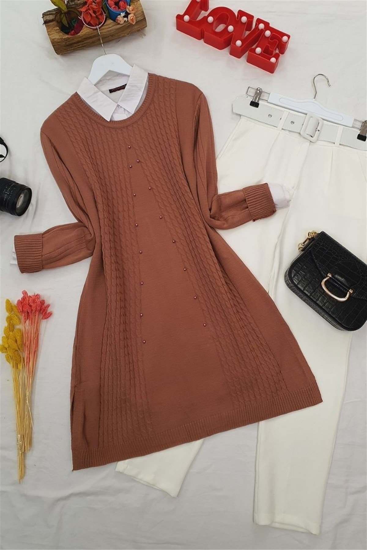 Bisiklet Yaka İnci Detaylı Pudra Tesettür Triko Tunik