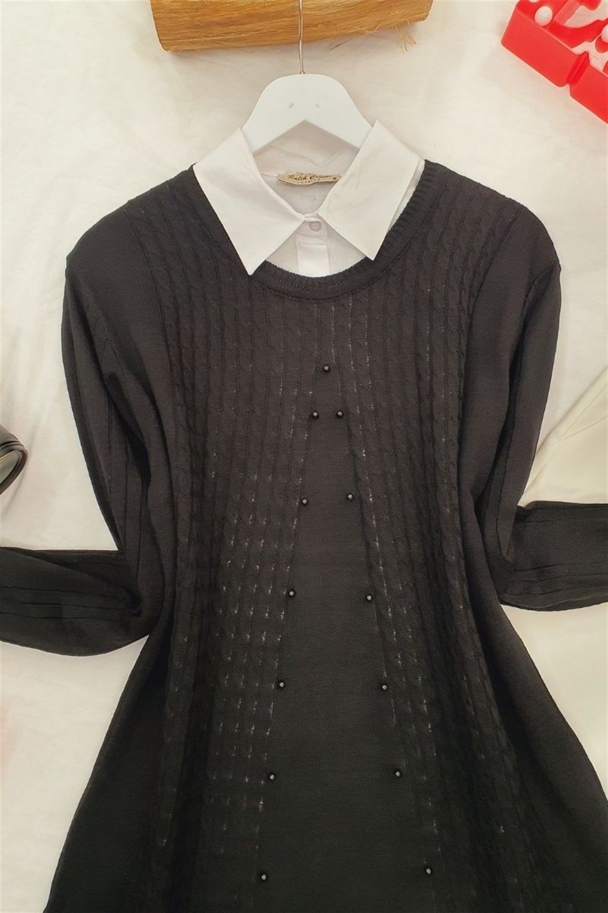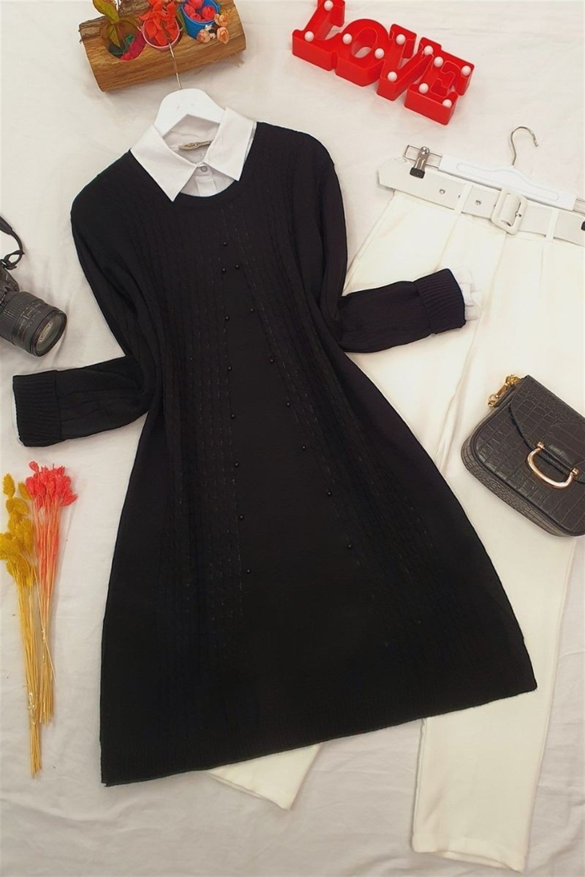 Bisiklet Yaka İnci Detaylı Triko Tunik -Siyah (280-531-R01)