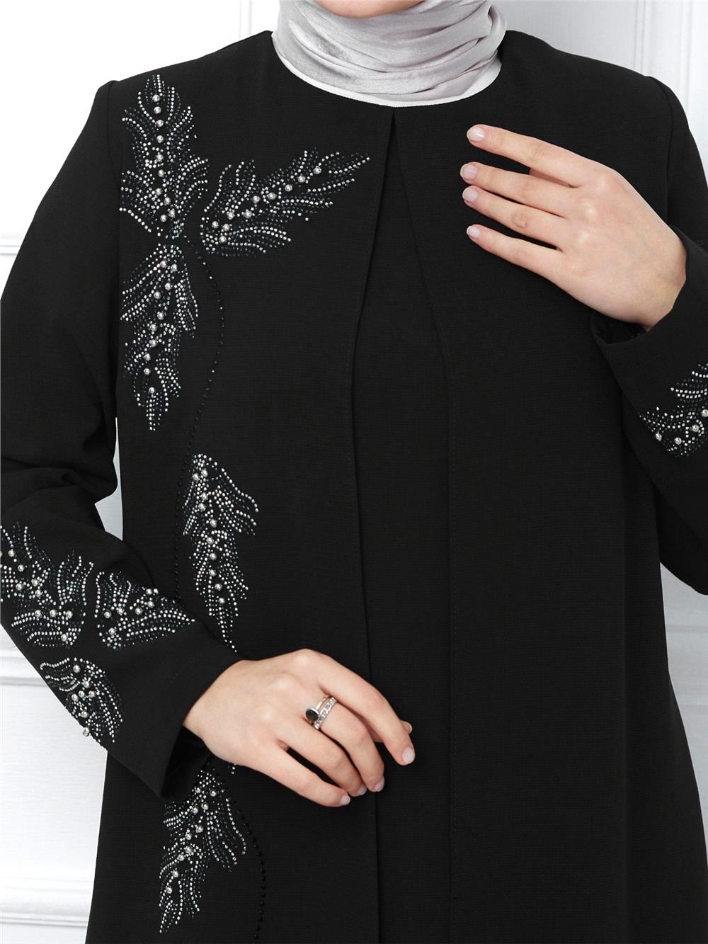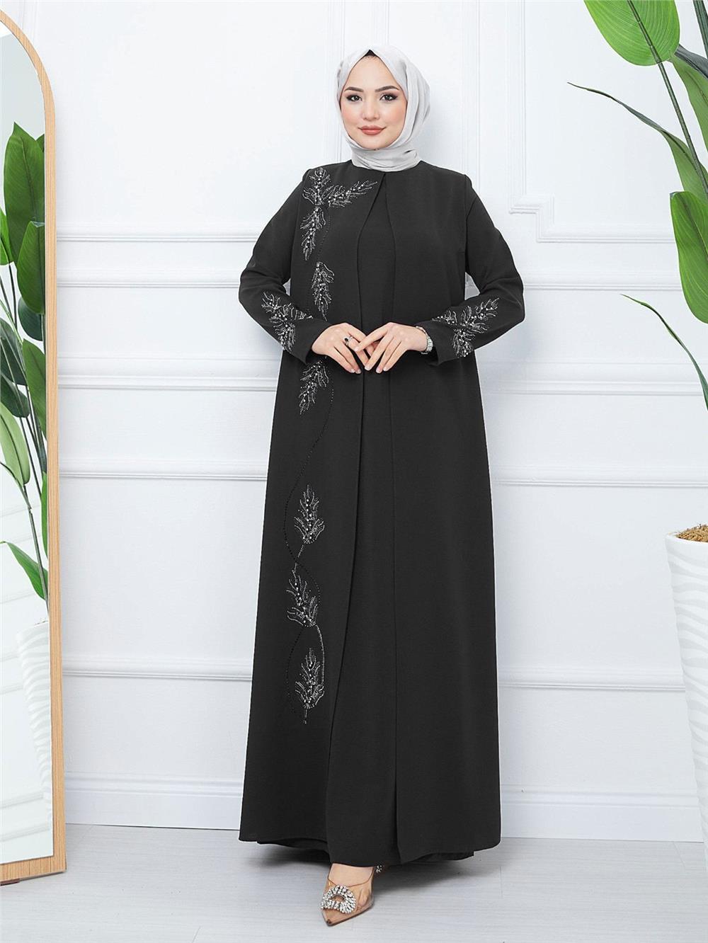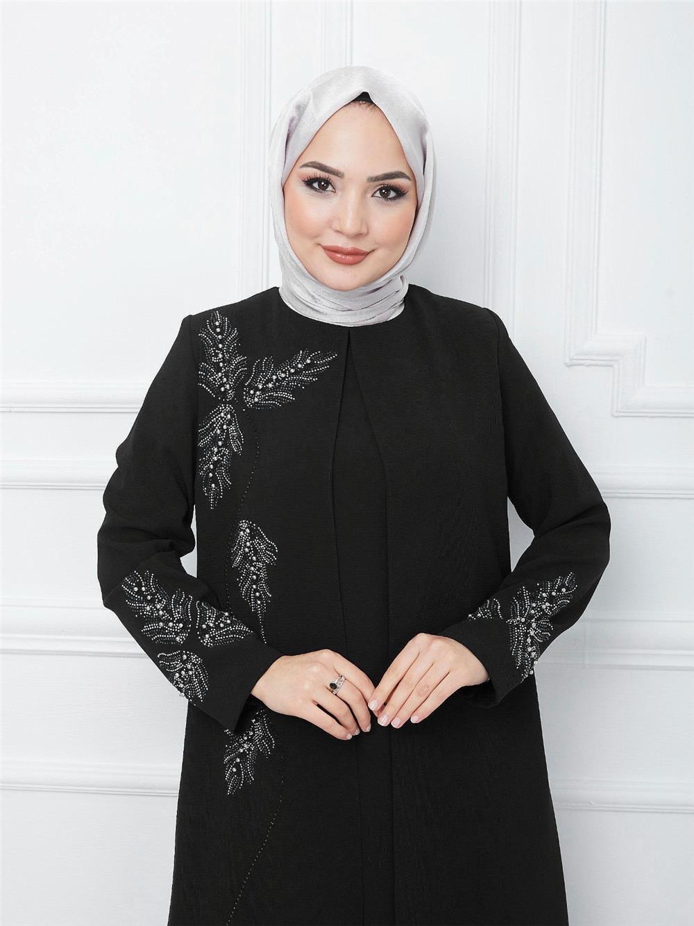 Boncuk Detaylı Çİft Kat Krep Elbise -Siyah (412-2005-R01)