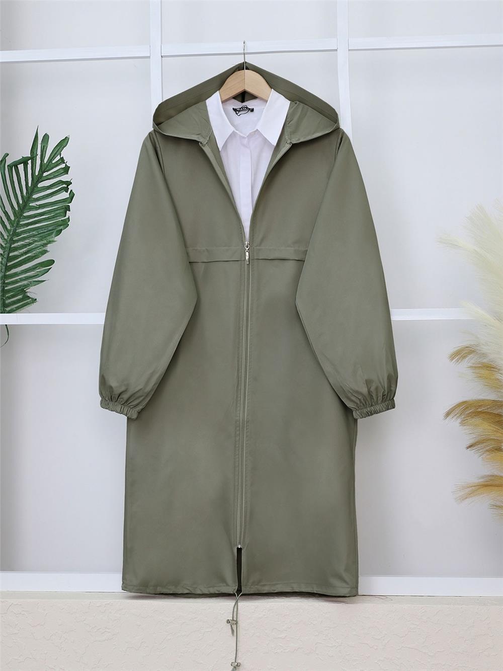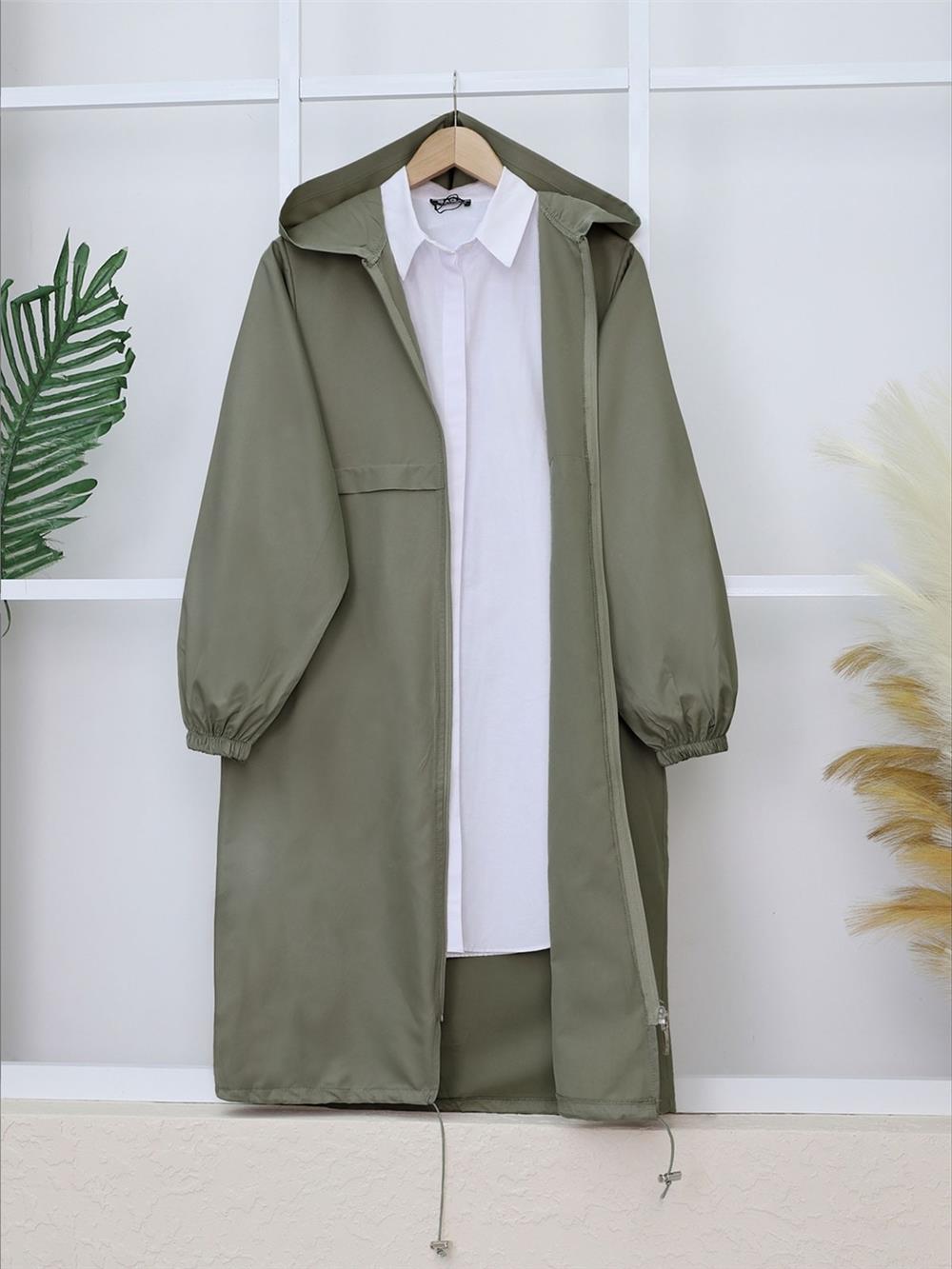 Boydan Fermuarlı Kapşonlu Uzun Yağmurluk -Haki (346-3041-R05)