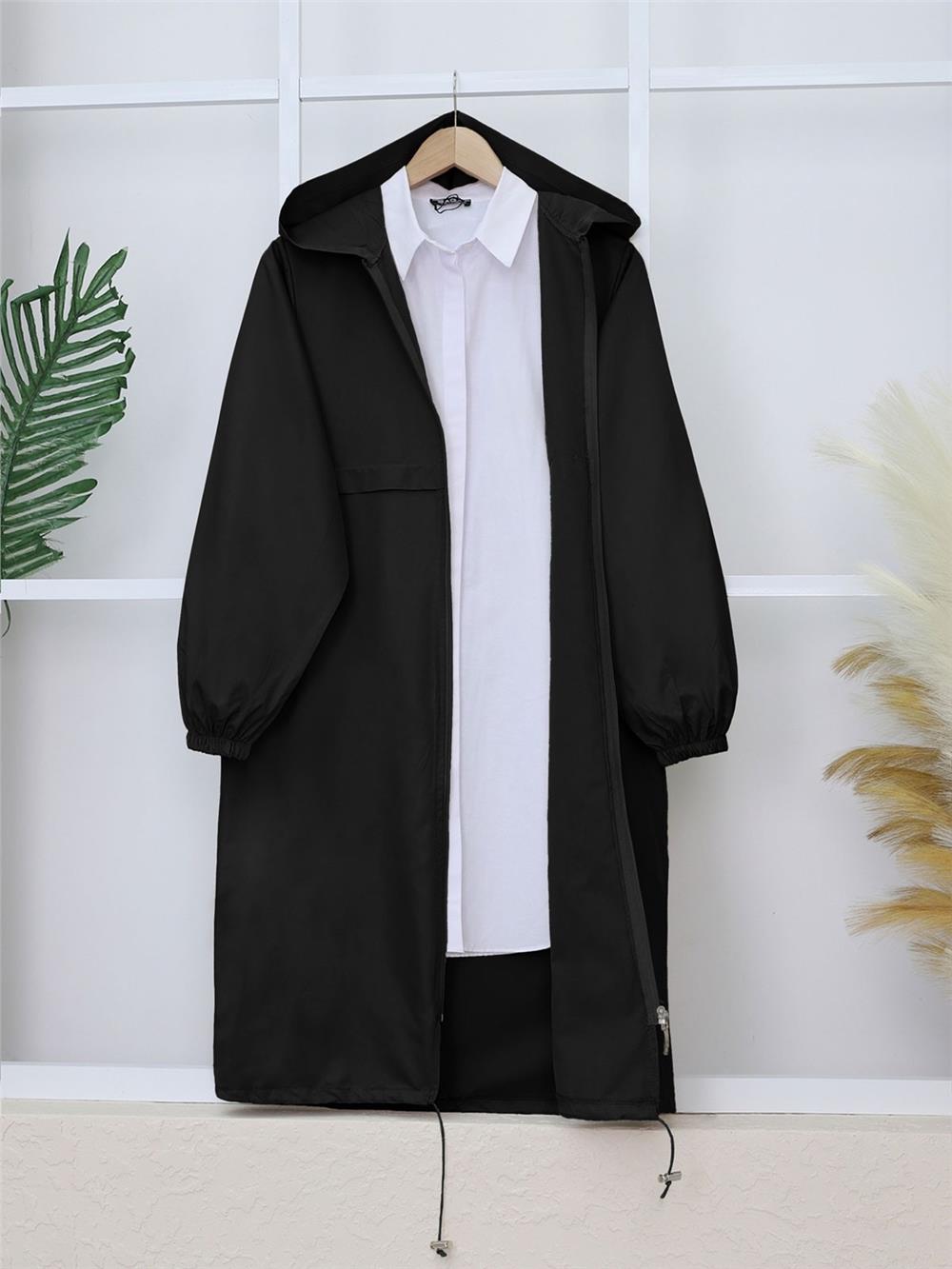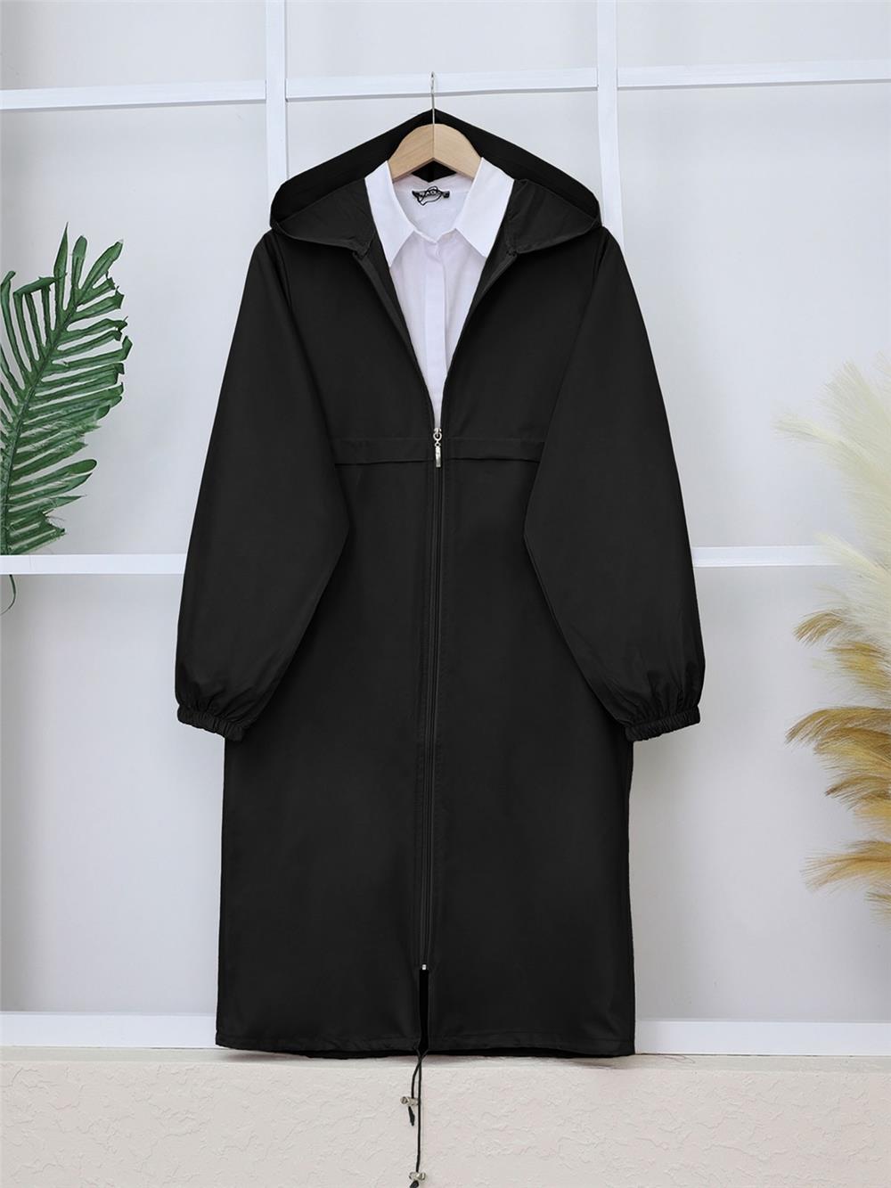 Boydan Fermuarlı Kapşonlu Uzun Yağmurluk -Siyah (346-3041-R01)
